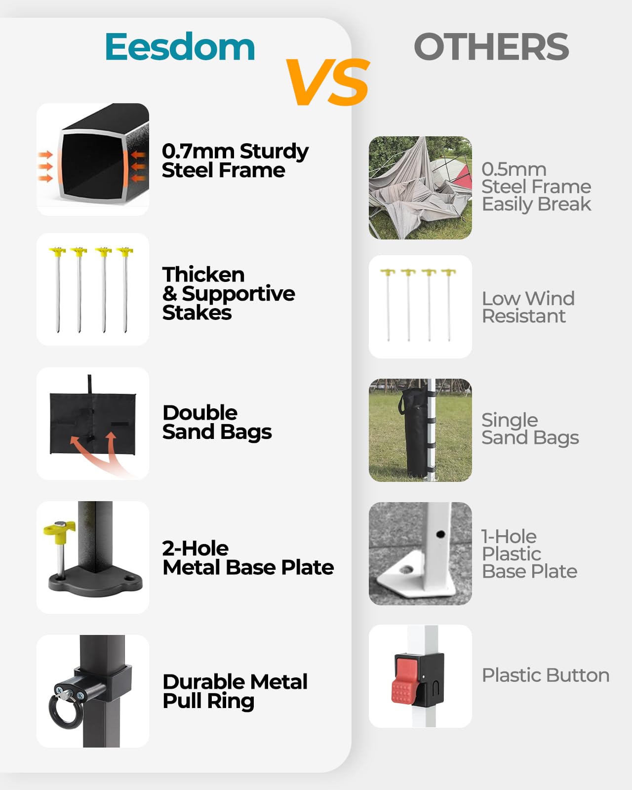 Enhanced Heavy-Duty Canopy Frame: The Eesdom 10x10 pop up canopy features a commercial-grade full truss design for maximum durability and rust resistance. The upgraded top bracket with a 32° tilt angle ensures a taut canopy cover, preventing water pooling. Thickened 33mm steel tubes with 0.7mm wall thickness provide superior strength