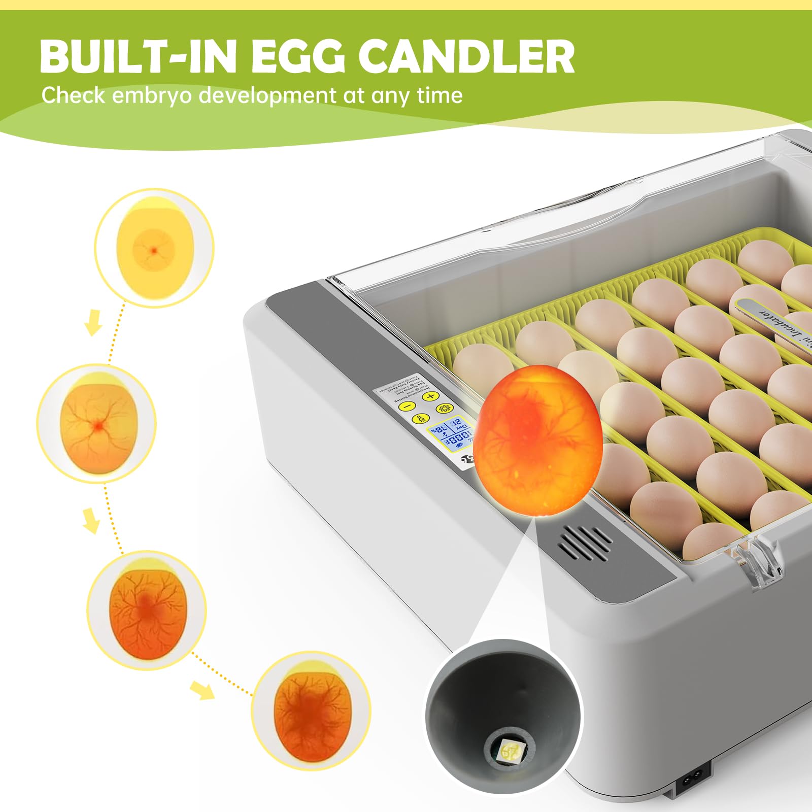 š¤š¤ćAutomatic Egg Turning Functionć--The egg incubator can adjust the bracket according to the size of the eggs and automatically turn the eggs every 2 hours to ensure uniform heat distribution and stable temperature during the incubation process to increase the incubation speed and reduce human intervention. Check embryo development during incubation using the built-in LED egg candle holder to easily check egg development.