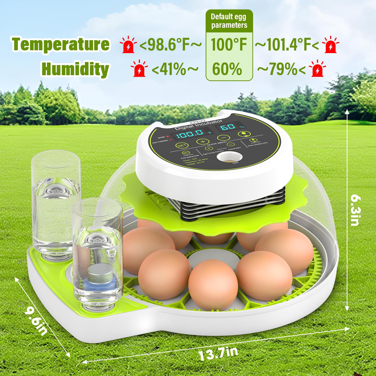 Incubator for Hatching Eggs:Our egg hatching incubator can hatch 8 eggs or 16 quail eggs, and it can also hatch various types of eggs, such as duck eggs, goose eggs, pigeon eggs, parrot eggs, etc.; Different varieties of eggs hatch at different temperatures and humidities, and you can adjust the incubator's temperature and humidity according to the types of eggs you are hatching (the system defaults to the hatching temperature and humidity of the eggs).