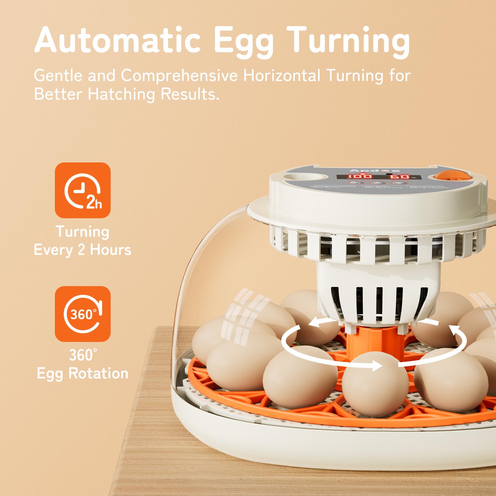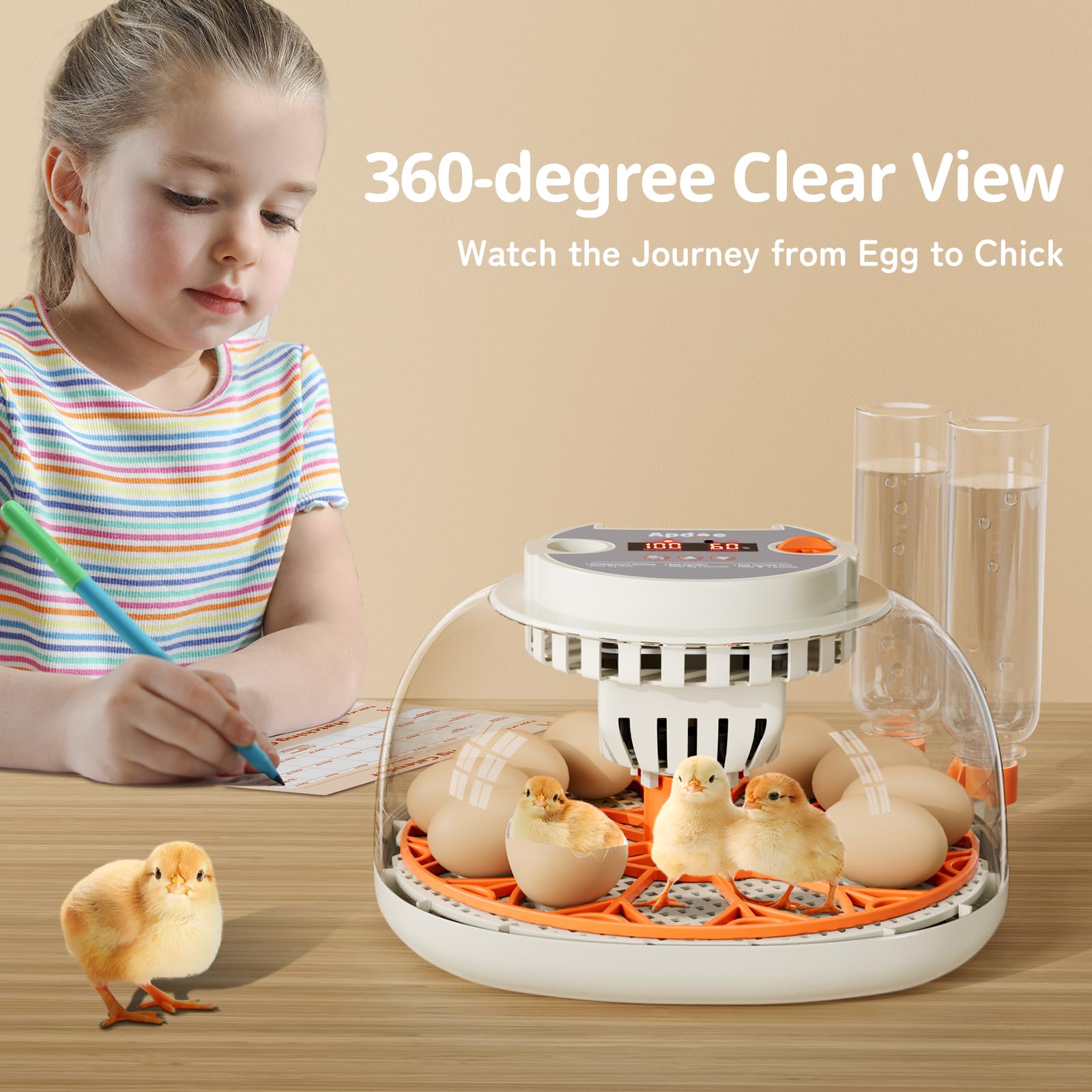 Apdoe 2025 Upgraded HatchPro 12: Temperature and humidity display for precise monitoring. Innovative 2-in-1 humidity control system and adjustable air vent provide more flexible and precise humidity management. The 360-degree transparent observation window allows you to witness the captivating journey from egg to chick, making it both educational and fascinating!