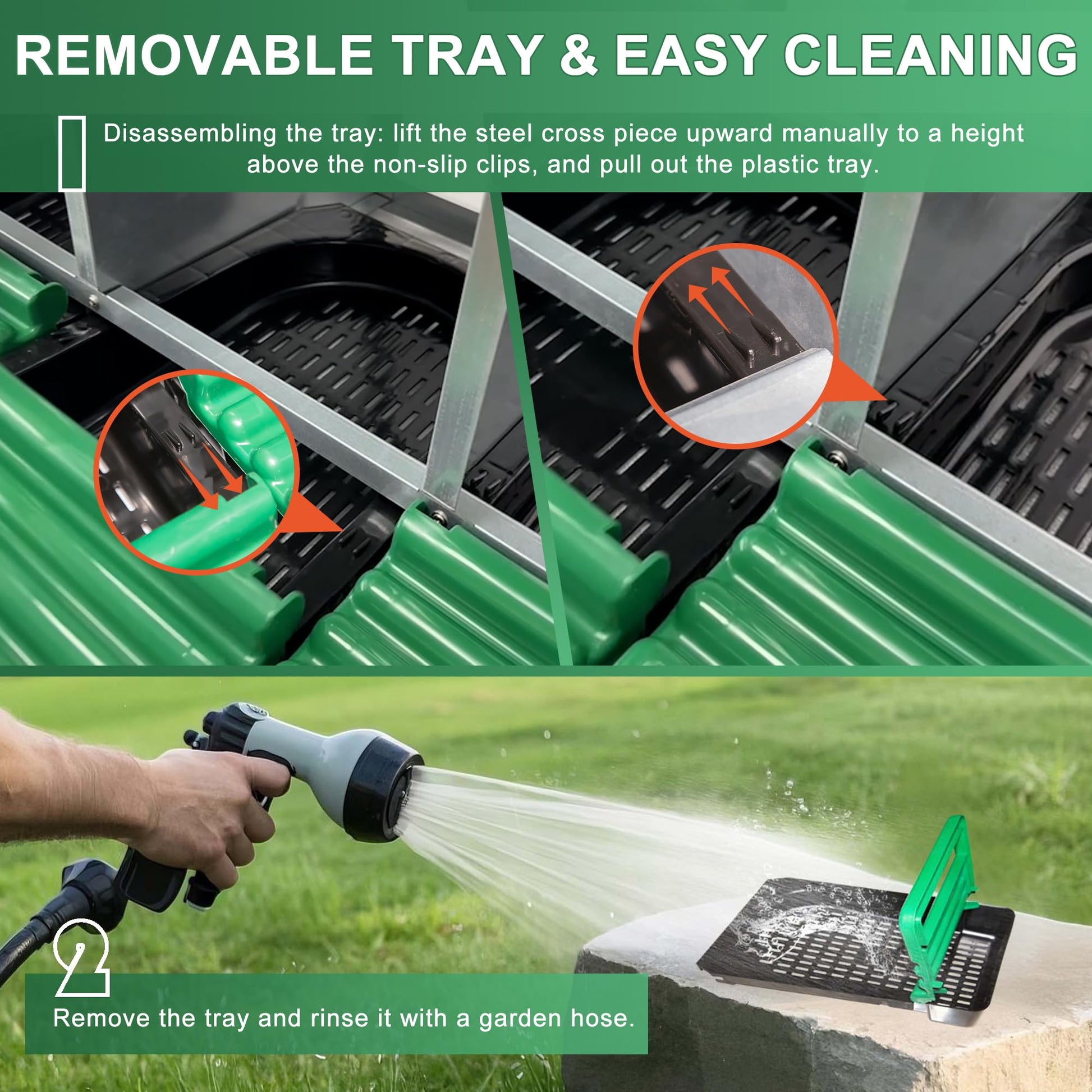 DESIGNED FOR LASTING: The side and roof are made with galvanized steel for strong construction, with ventilation holes to provide fresh air for hens and keeps the nesting box dry and cool. The trays are made with plastic that won’t rust and are easy to clean