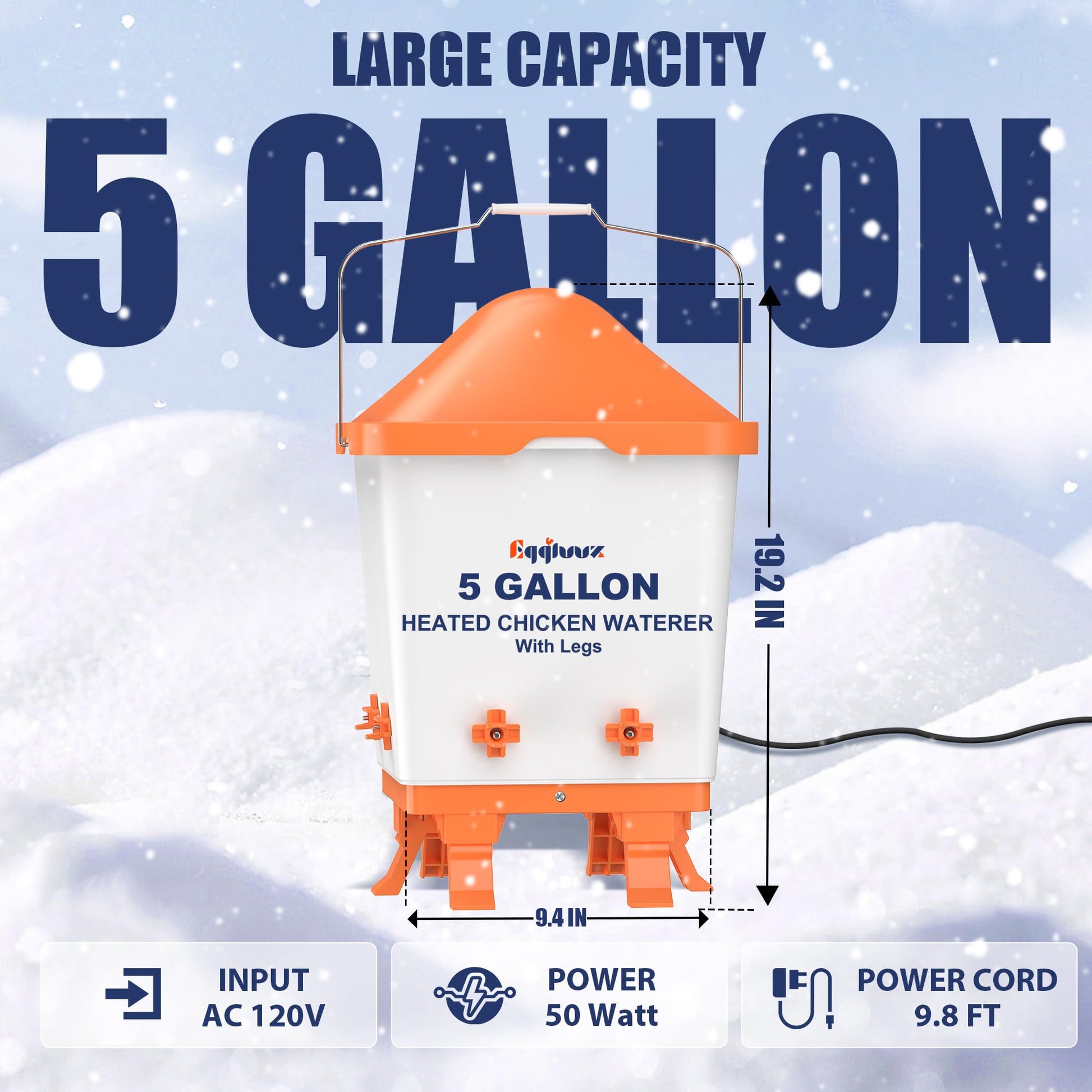HEATED CHICKEN WATERER: Provide constant access to fresh clean drinking water for your chickens with this 5 gallon heated chicken waterer during cold winter months and prevents water from freezing as low as 10 °F