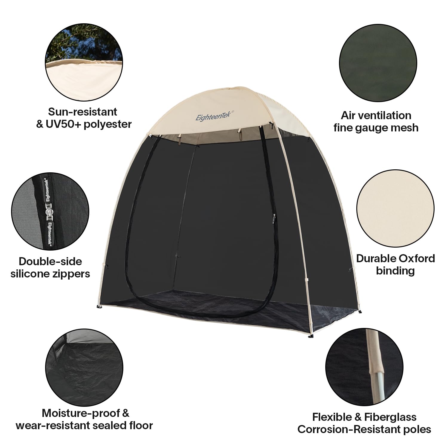 Pop up & Easy Take Down: All Weather sports tent pod screen room pop up automatically, no assembly needed, set up in a second. Lightweight, only 7.7 lbs, making it effortless to carry. Pop-up patio canopy comes with a convenient & compact carry bag measuring 52"x41.3"x1", allowing for hassle-free storage and transportation. EighteenTek pod screen house is a versatile and essential addition to your outdoor gear.