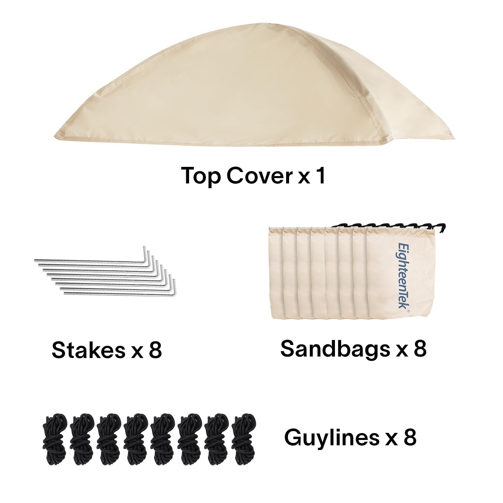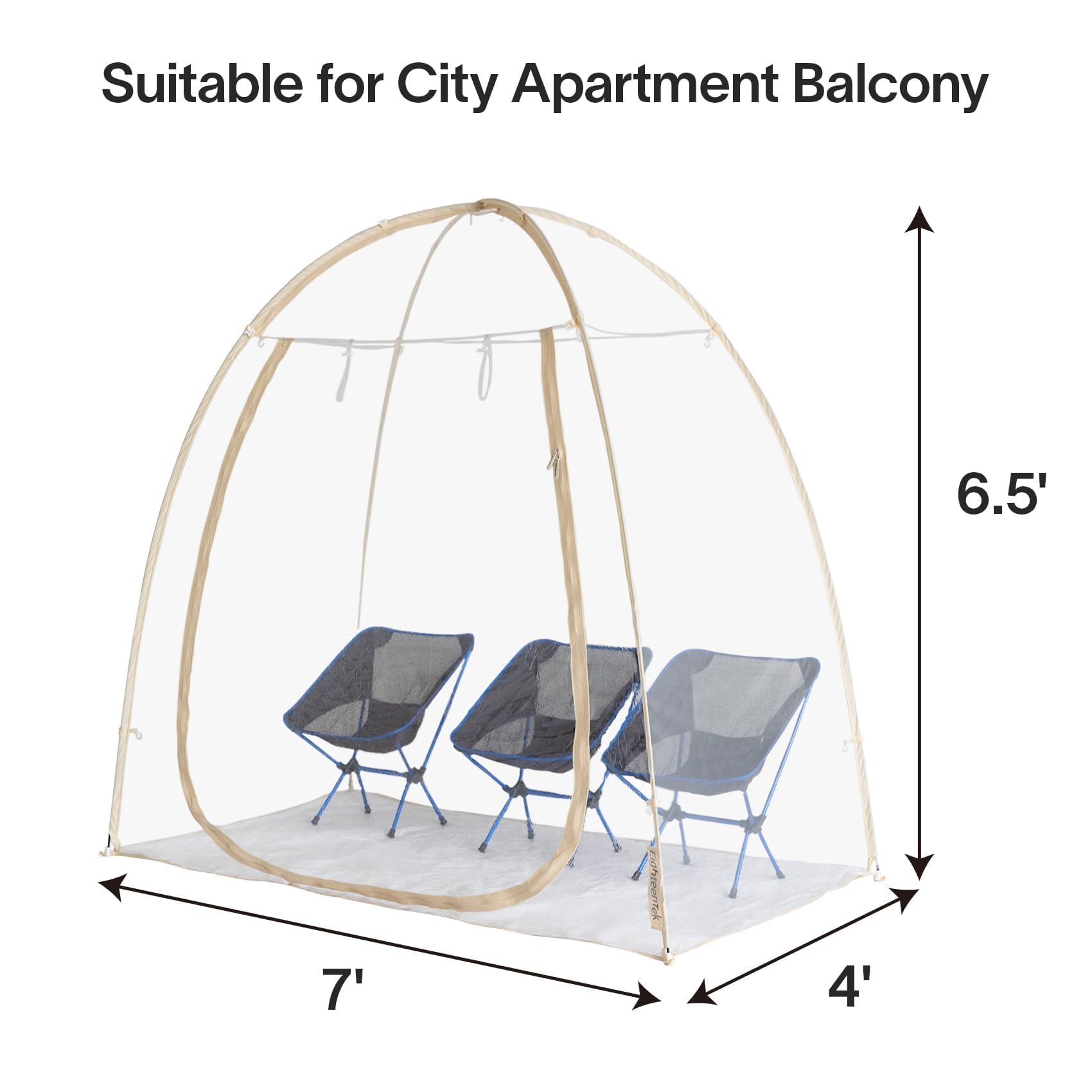 DURABLE WITH PATENT PENDING DESIGN SAFEGUARDS: Featuring a zippered top window for ventilation, a spacious entrance door with double-sided silicone zippers, and additional hooks for your belongings. The low entrance offers easy wheelchair access, while the inclusion of 8 elongated sandbags, 8 guylines, 8 mounting stakes, and a sealed PE floor in the clean bubble tent ensures extra stability in windy conditions. Plus, a single UV-protection sun shade sail provides sun protection and privacy.