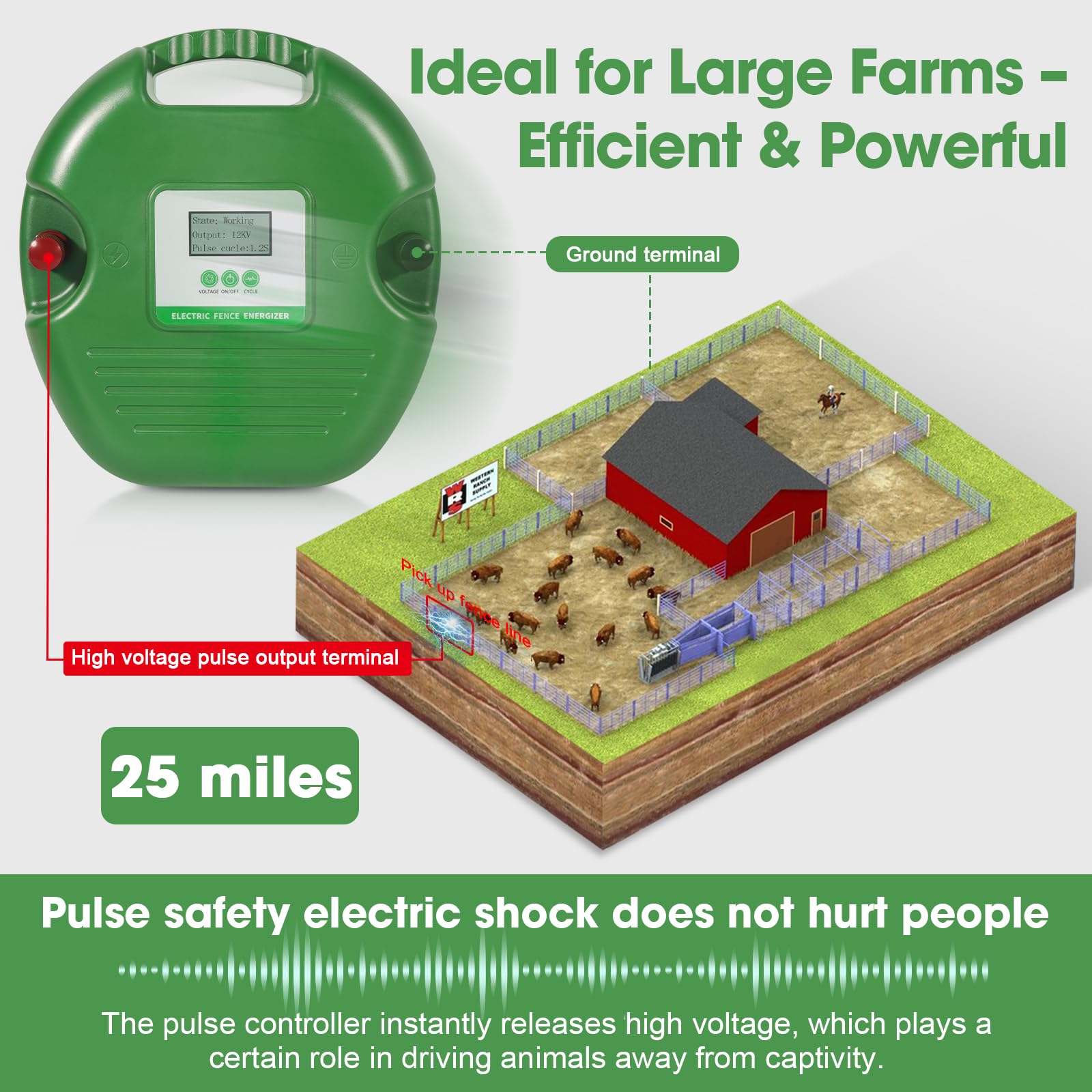 📏 Extended Range – Covers Up to 600 Acres / 25 Miles With 15-joule stored and 14-joule output, this electric fence box powers long perimeter fences in low-vegetation areas. Adjustable pulse interval (1.2–2.0 seconds) optimizes both reach and energy efficiency.