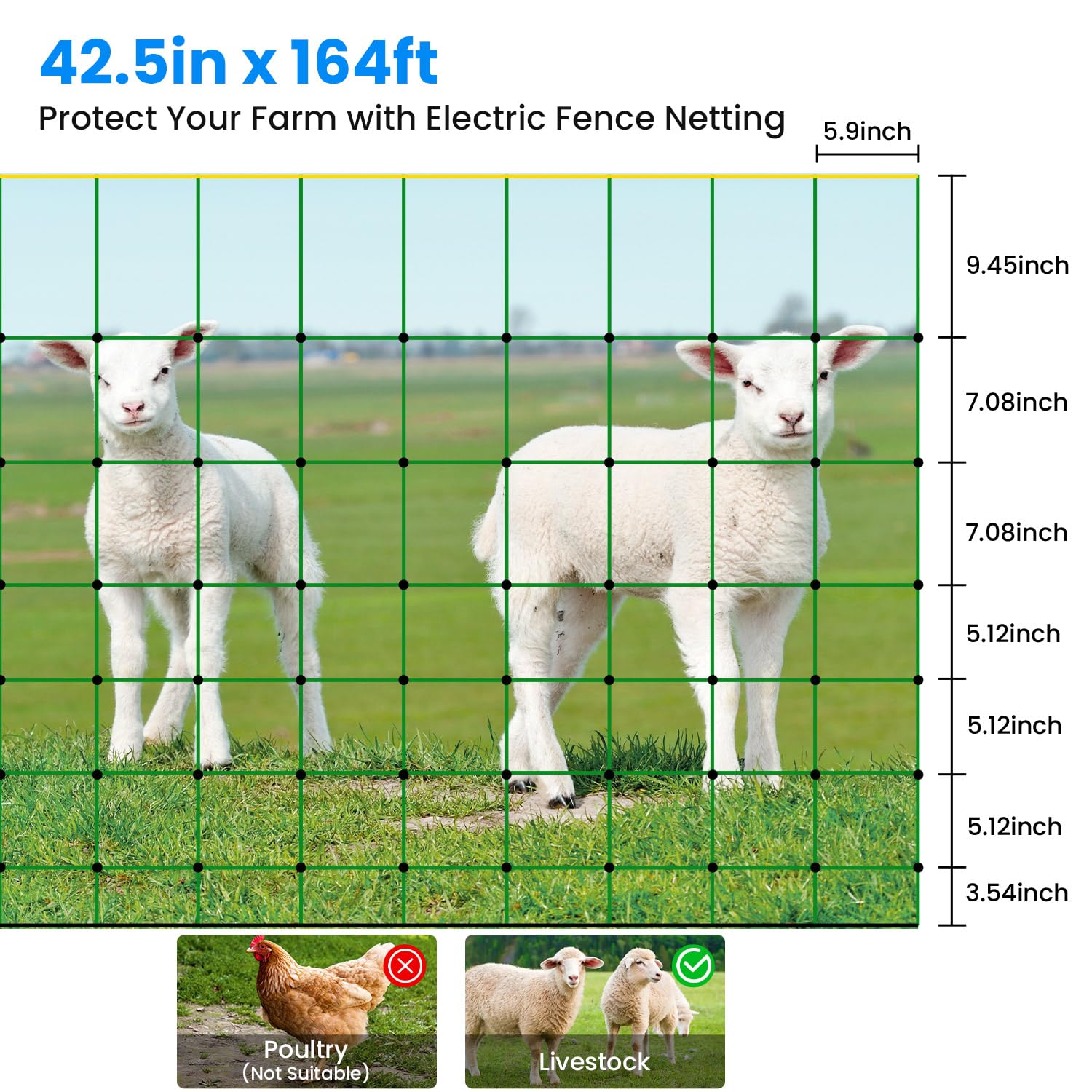 Electric Fence Netting, 42.5" H x 164'L, Portable Livestock Fencing Used in Backyards, Farms and Ranches, Electric Netting Fence for Cattle, Sheep, Goat, Hogs, Net Fencing with 14 Posts Double Spiked