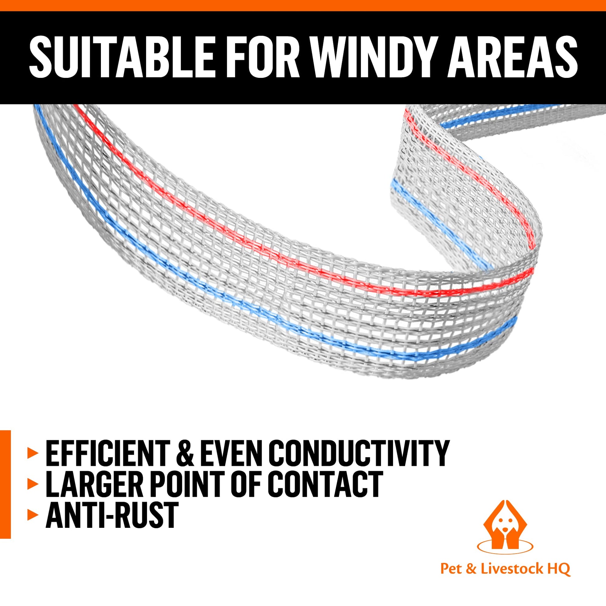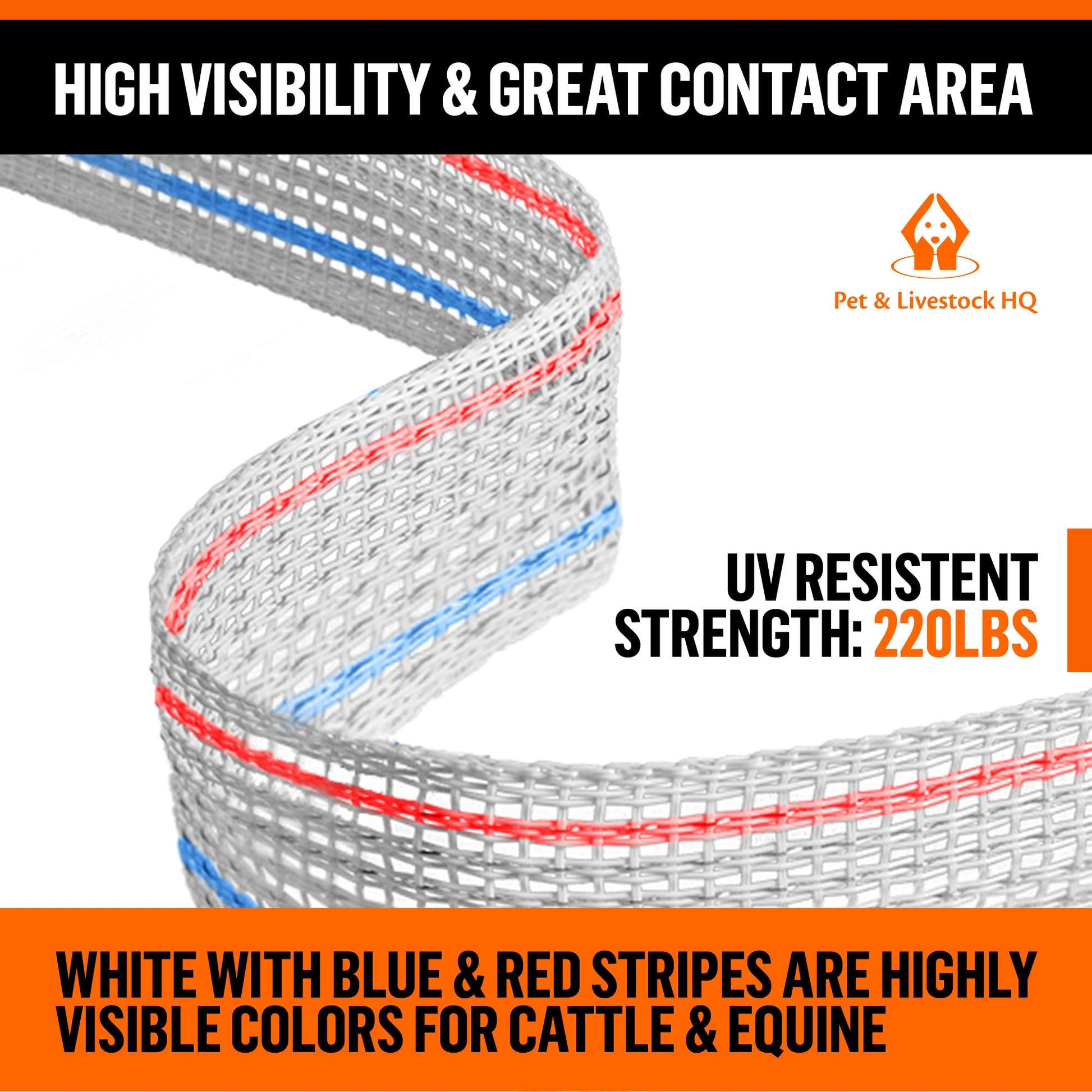 High visibility electric fence tape: 0.8 inches wide, white polytape is highly visible to animals and humans and will discourage your livestock from coming close to the fence. It is suitable for portable and semi-permanent electric fences