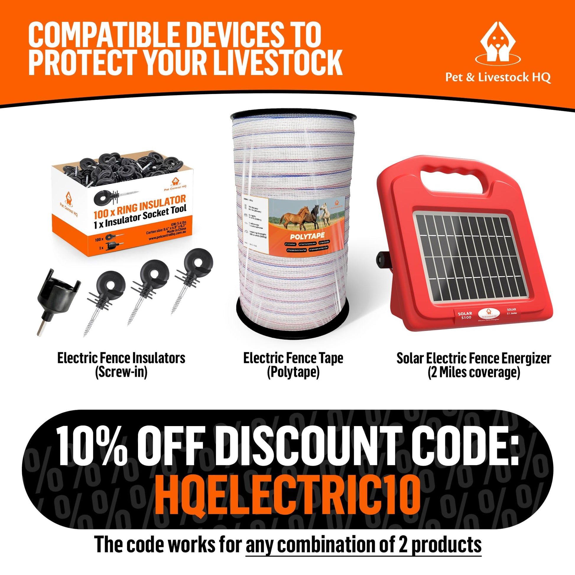 High conductivity poly tape: Pet & Livestock HQ poly tape consists of 6 inter-woven and highly conductive stainless-steel strands. Stainless steel is a great conductor of electricity, it doesn’t rust, and it doesn’t break like aluminum wires