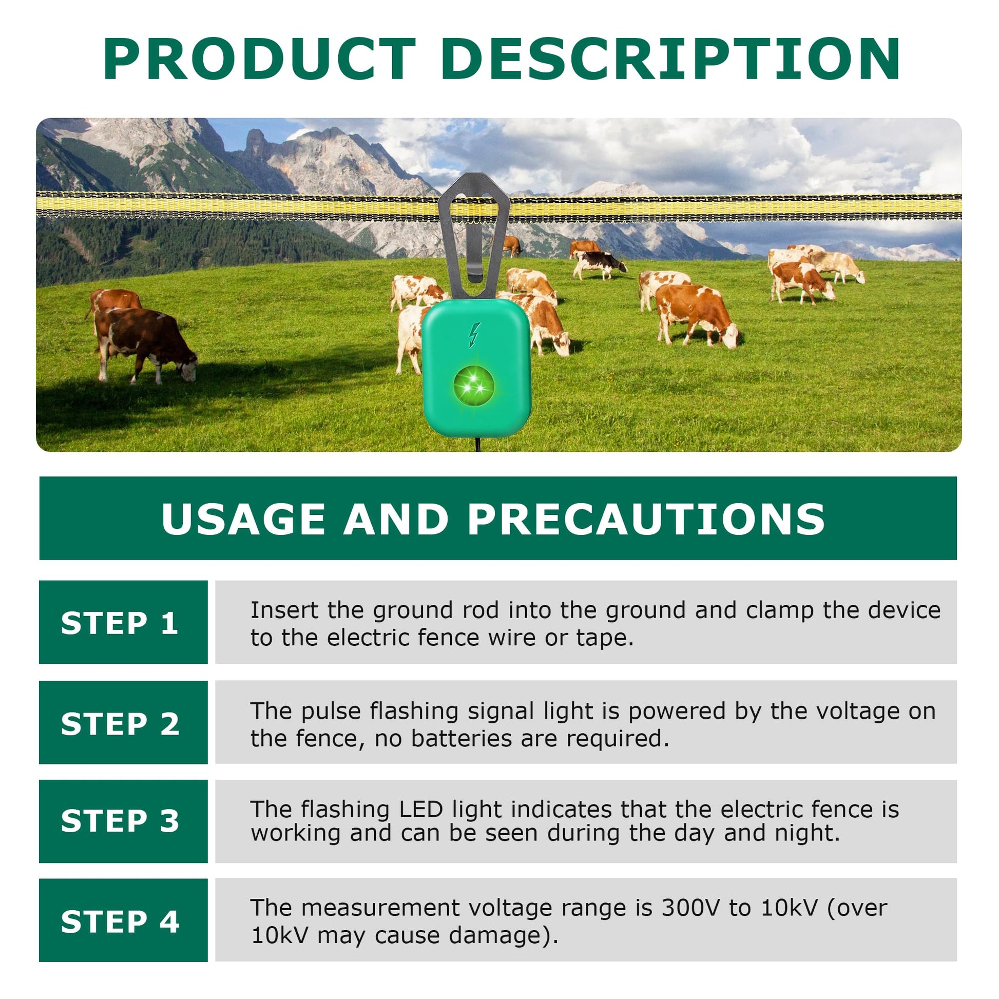 Easy to use: just clip on the fence and insert the probe into the ground. No batteries or external power supply required. Can be placed anywhere on the fence