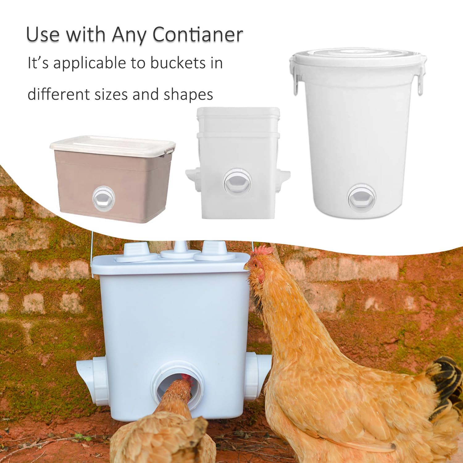 It takes only a few minutes to build your chicken coop feeder, no matter 3 gal or 5 gallon, any size and shape containers, transform a bucket, box, barrel, or bin into a large chicken feeder