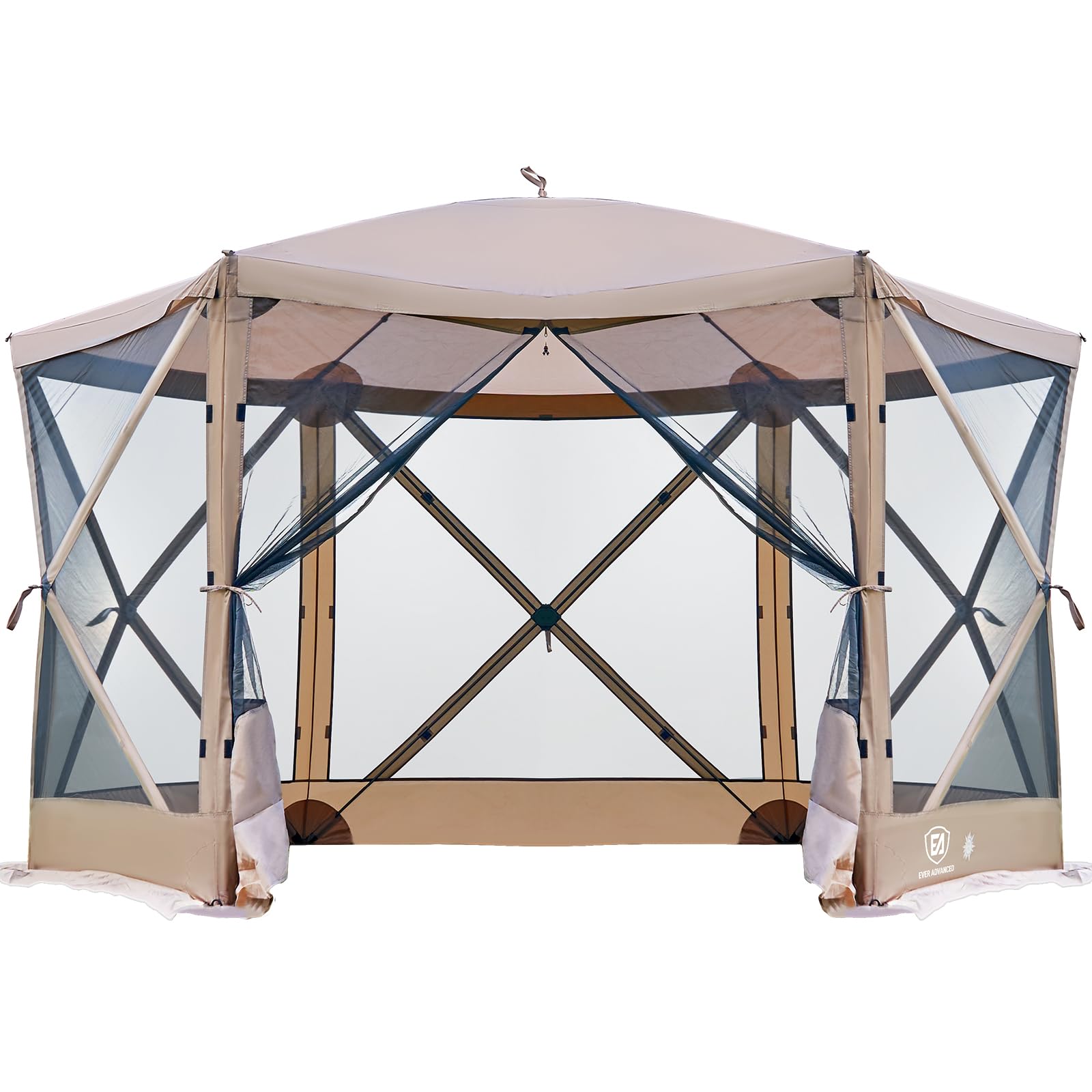 EVER ADVANCED Pop Up Gazebo Screen House Tent for Camping 11.5 ft for 8-10 Person Instant Canopy Shelter with Netting Portable for Outdoor, Backyard, Brown