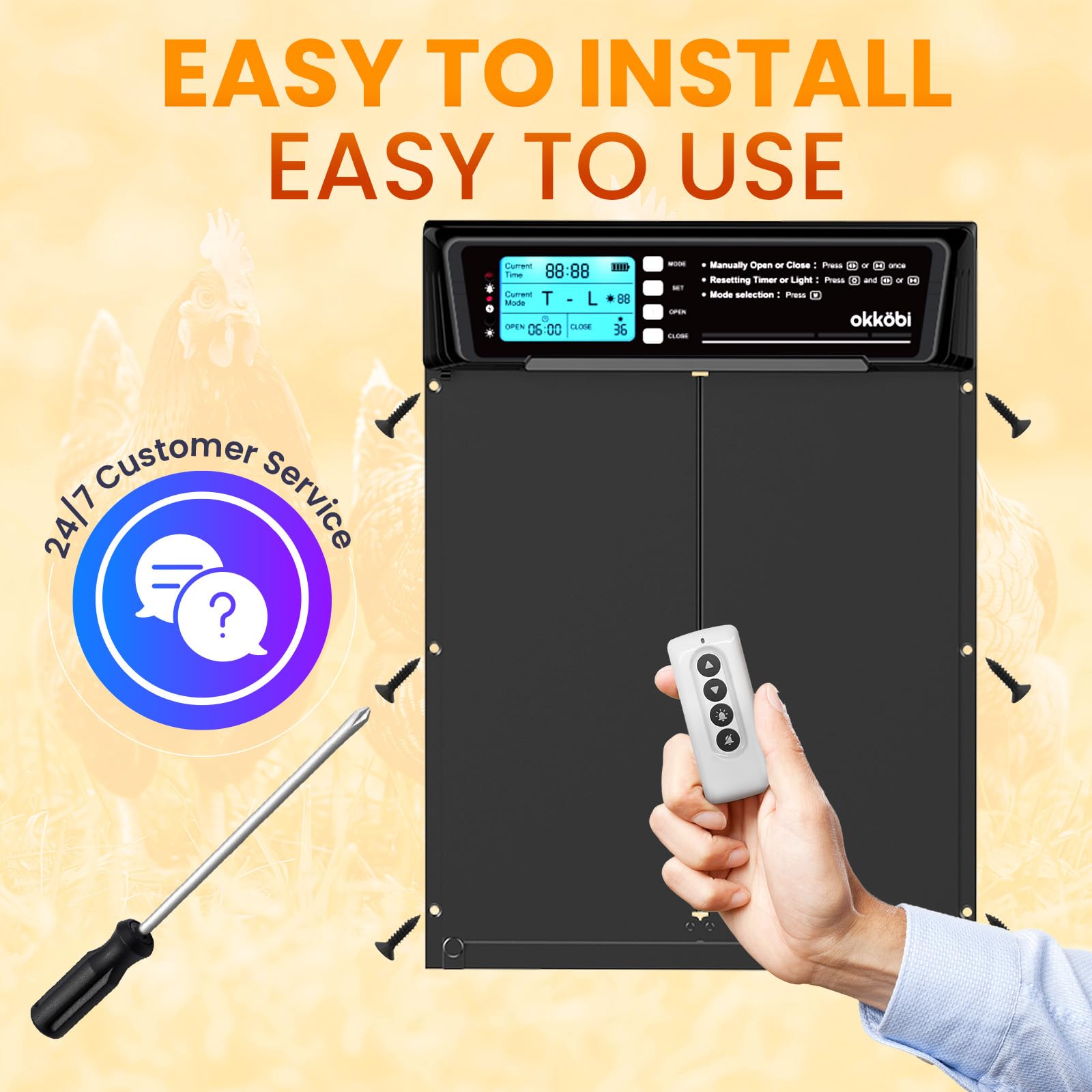 Extra Large Automatic Chicken Coop Door Solar Powered with Remote - LCD Display, Light Sensor, Timer & Anti-Pinch Function – 11.3" x 8.7" Door Opening – 5-Year Protection – Black – by Okköbi