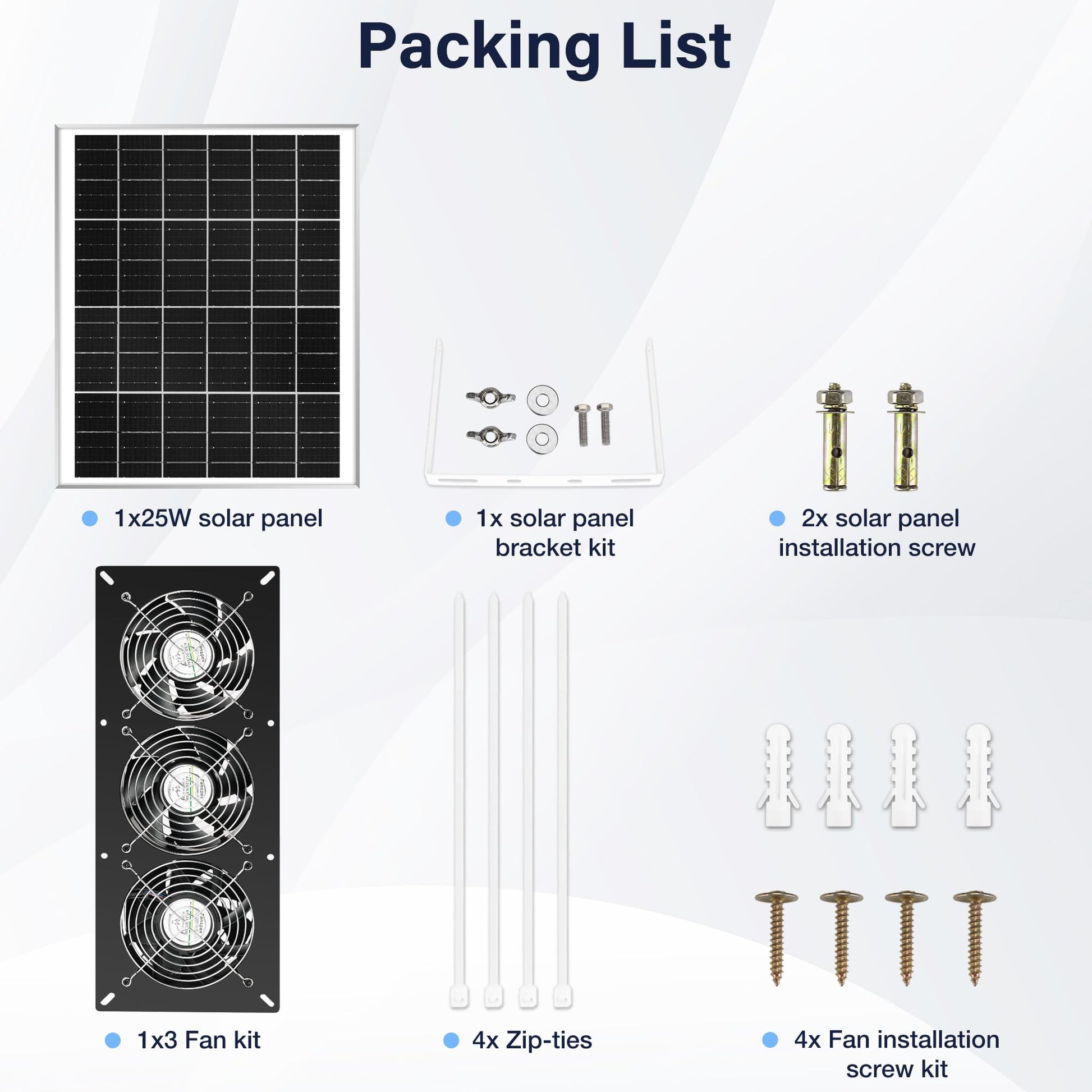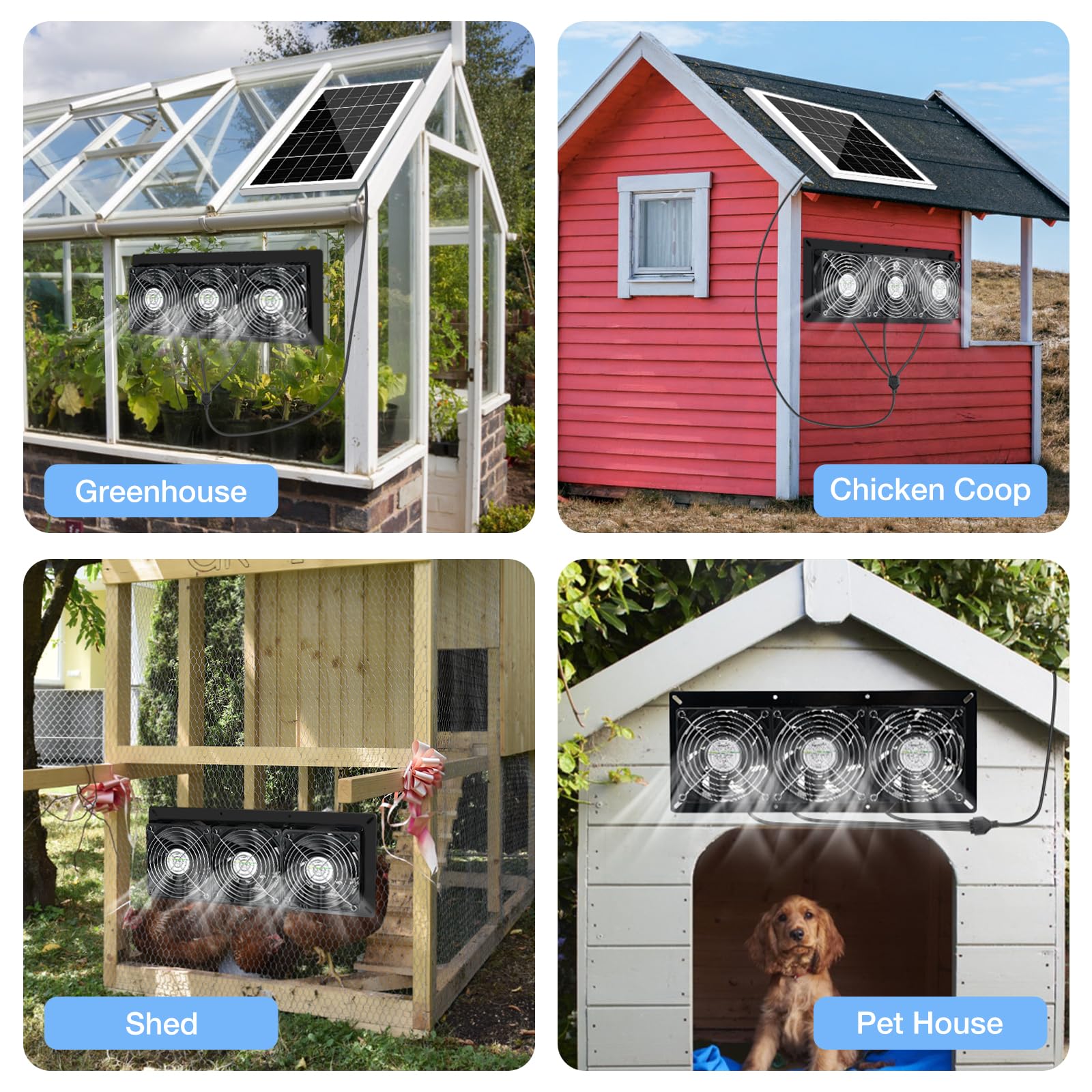 Solar 3 Fan Kits: It’s newest design with 3 fan kits by solar powered, 3 x Fans kit, 3 x Times Air-volume. Intake or exhaust air, 2 ways air-circulation, DIY fan kit wind direction according to your requirement. The original fan kit set-up is 2 fan exhaust, 1 fan intake air.
