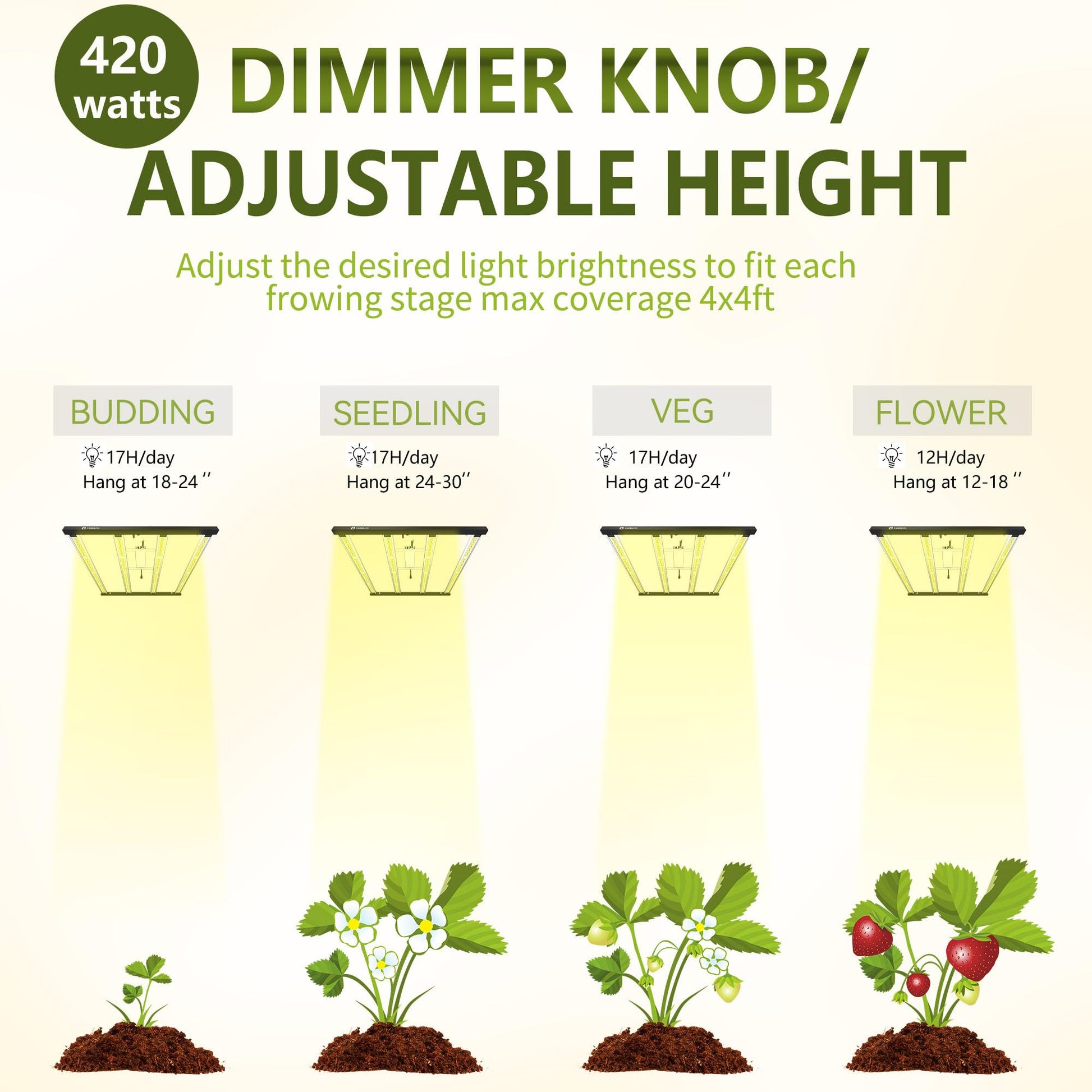 【Max Coverage Area Plant Lamp Full Spectrum】420watts grow light full spectrum (380-410 nm, 660-665nm, 730nm,3200-4200K,4800-5000K) is perfect for veg to grow,4 LED grow lights bars with 1580pcs Samsung diodes, it can provide evenly distributed light intensity.It can coverage for 4x5ft of high-yielding full-cycle growth.