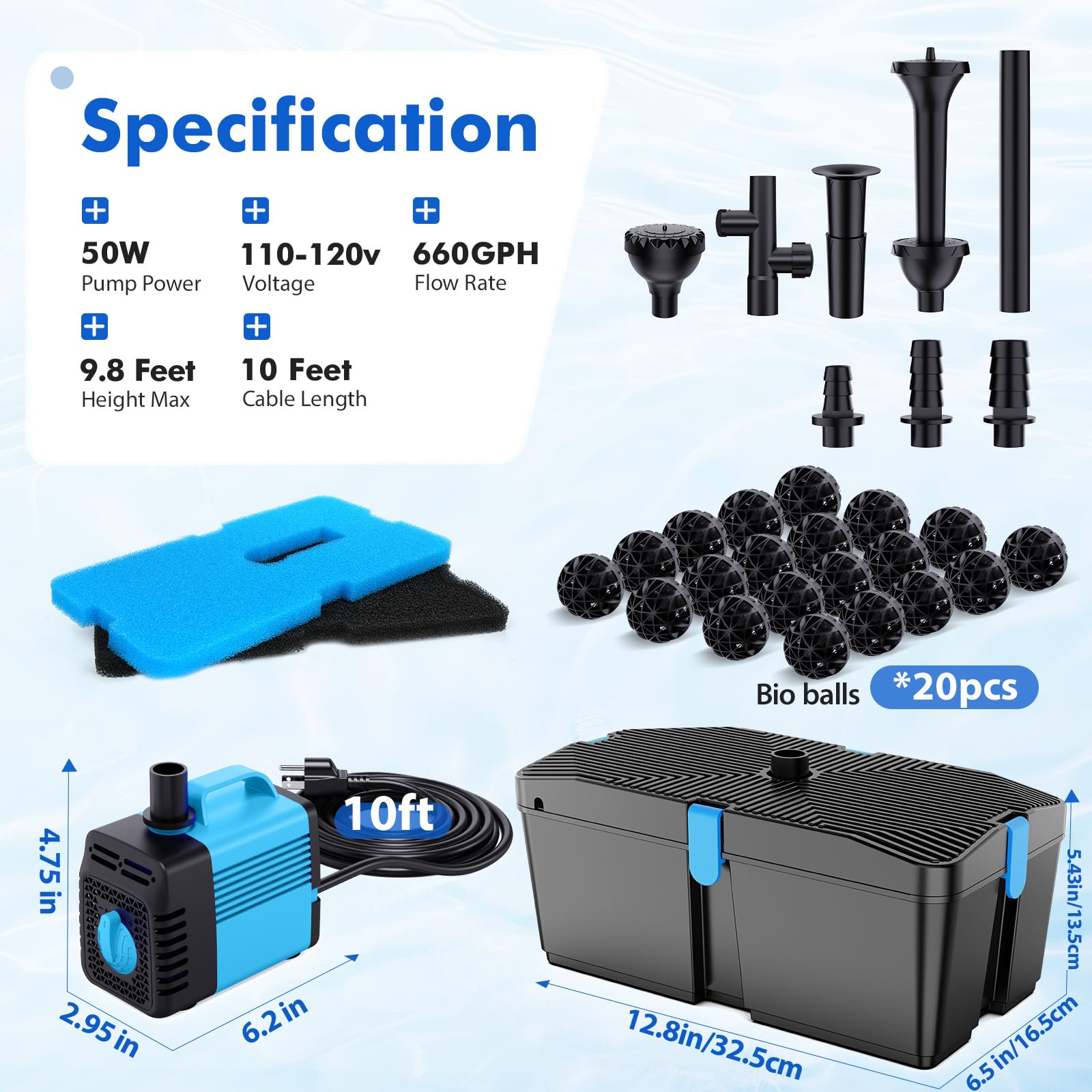 🐟【Powerful Pond Pump Filter】Our koi pond filter includes a high performance 660 GPH pump, ideal for ponds up to 1200 gallons. It provides strong, quiet water flow, creating a relaxing sound with adjustable water flow to suit your needs. It ensures rapid water circulation and effective