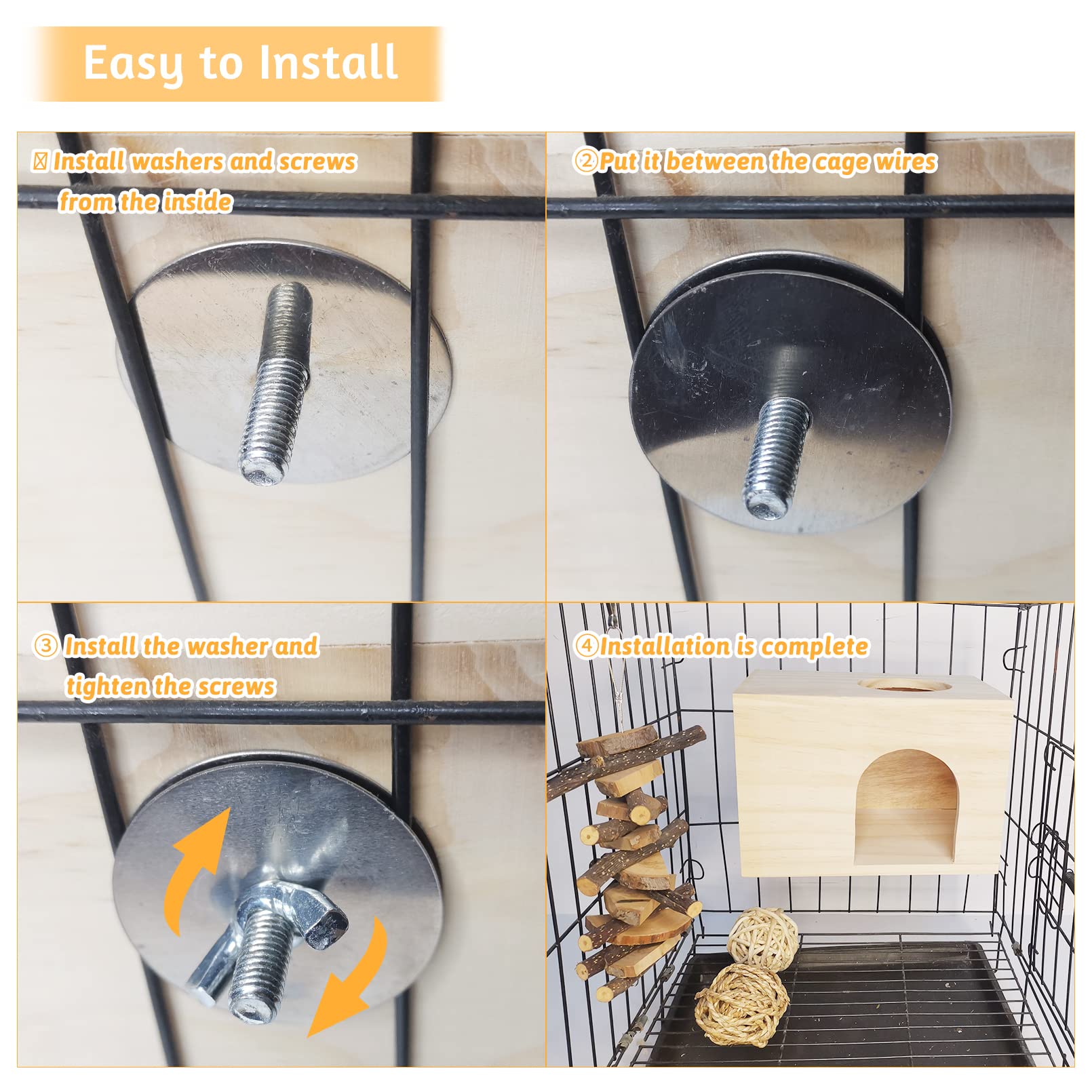 [Easy to Install]: The guinea pig hut has been pre-drilled, and a washer is placed inside and outside the wooden house, placed between the two lines of the cage, and screwed on the screws and nuts. It is strong and durable