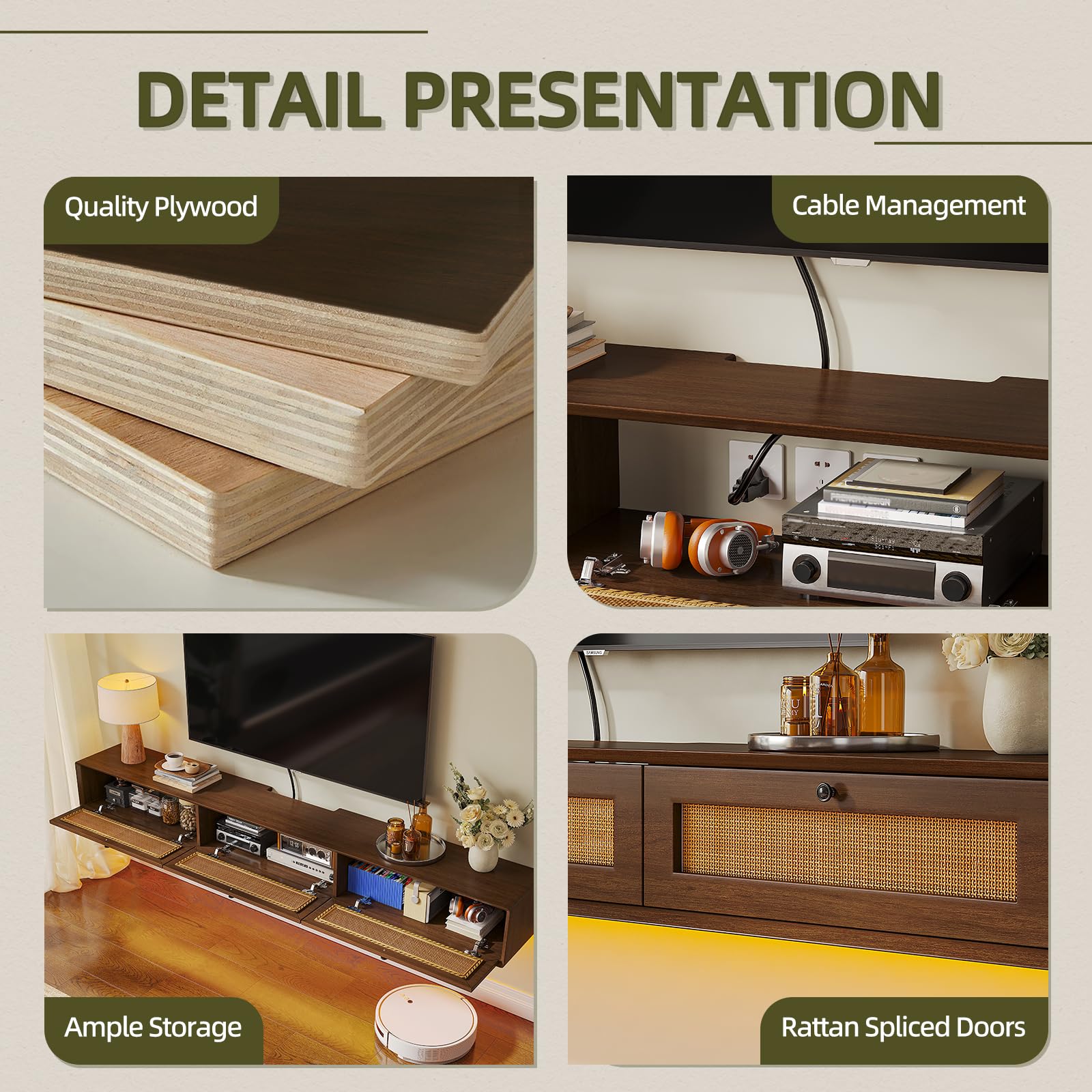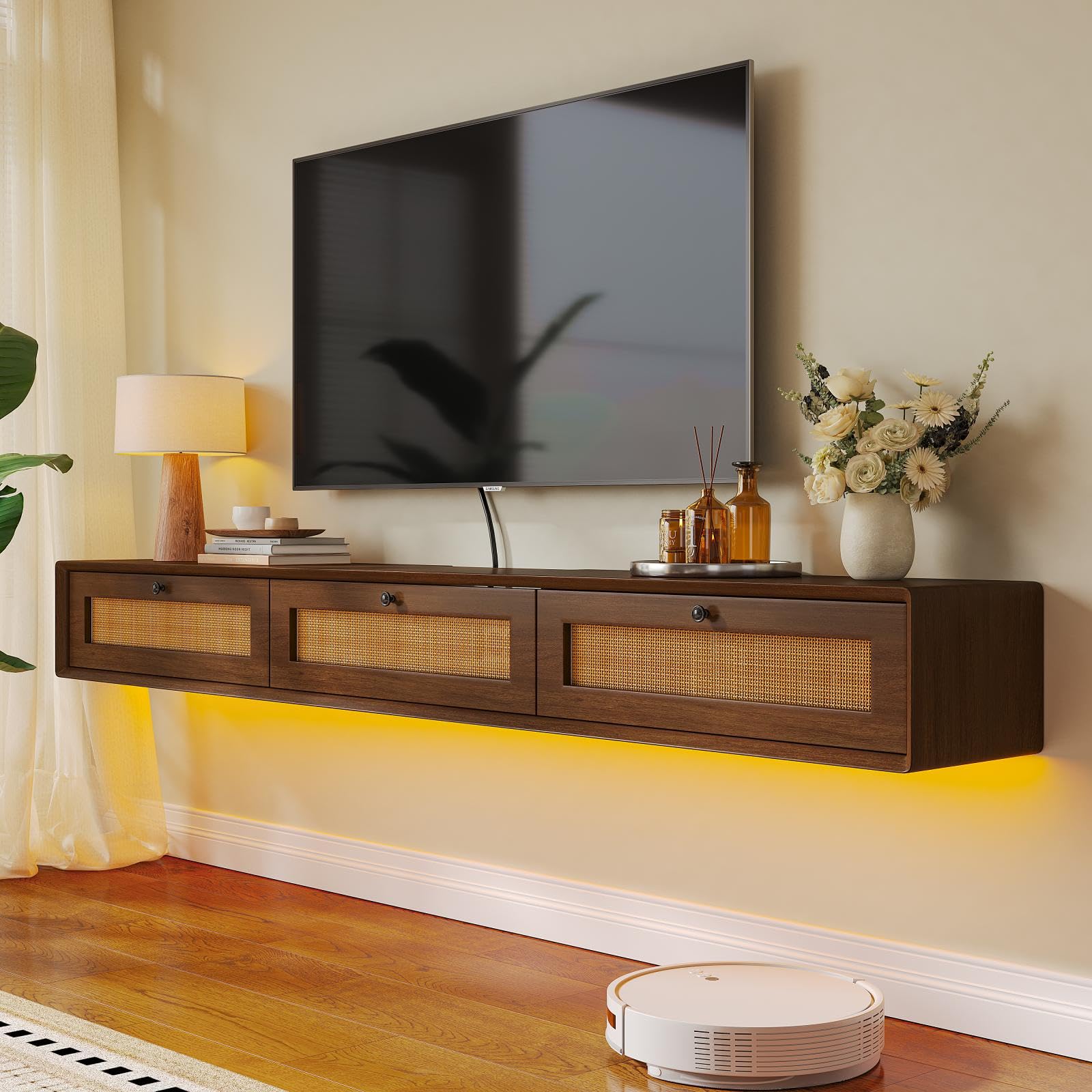 [Floating TV Stand with Rattan Doors] Elevate your living space with this elegant floating TV cabinet, featuring a walnut finish and hand-woven rattan doors for a touch of organic texture. The design blends seamlessly with boho, farmhouse, or mid-century modern decor.