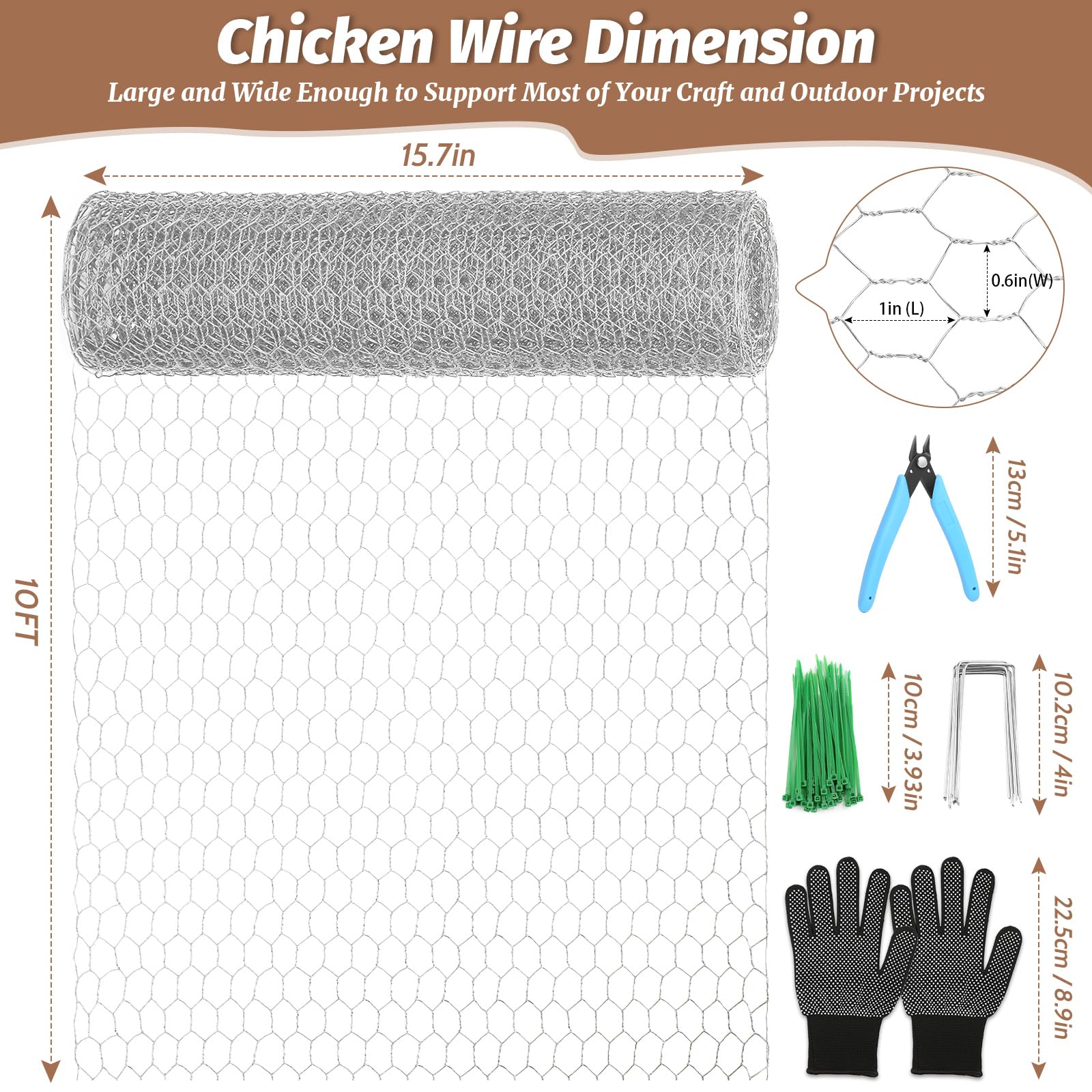 ✅All-Inclusive Kit with Practical Accessories: This all-in-one chicken wire mesh kit includes everything you need to start your project right away: one roll of floral chicken wire (15.7 Inch x 10 FT), 1 wire cutter plier, a pair of gloves, 100 zip ties, and 15 U-shaped hooks. Whether you're building chicken wire fencing for your poultry coop or crafting a custom chicken wire roll display, this set offers exceptional convenience and value.