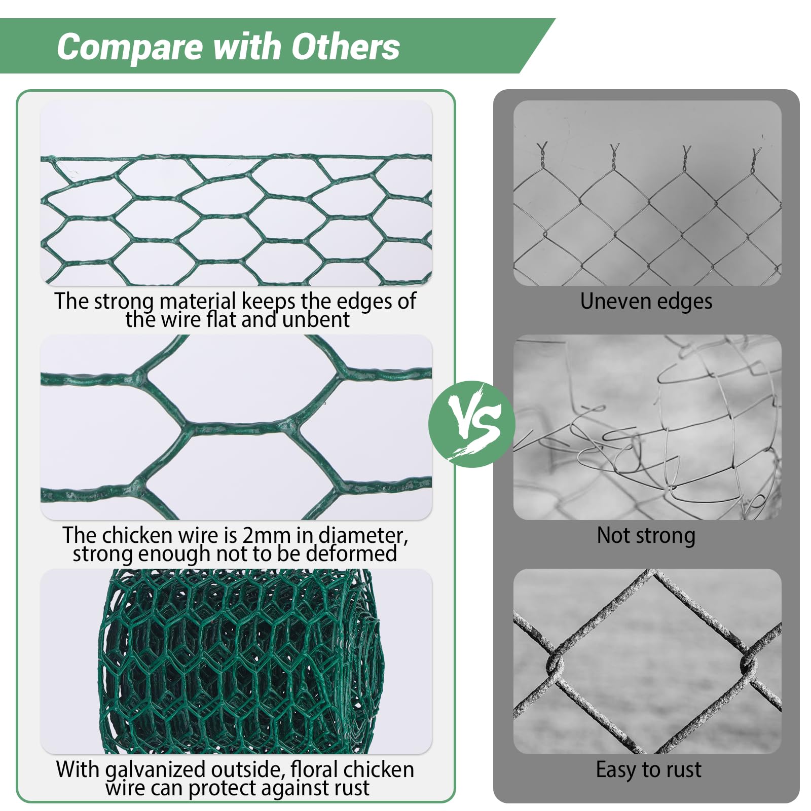 High-Quality Material: Our chicken wire fencing is made of high-quality galvanized iron with a wire thickness of 2mm. The iron green chicken wire can against rust and corrosion protection. The galvanized wire mesh roll is soft and flexible, bendable and cuttable, and lightweight but stronger than nylon or plastic mesh netting, which makes your outdoor projects stronger and longer.