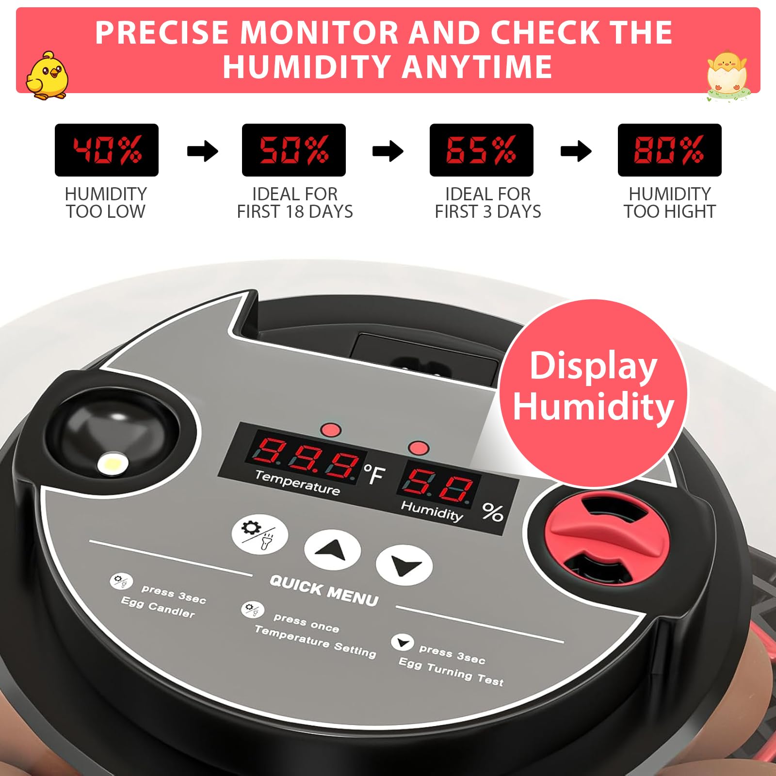 【No More Dead Embryos】Auto-egg turning every 90 minutes (adjustable 45°-180°) mimics mother birds, preventing membrane adhesion. 3D airflow system distributes heat evenly.