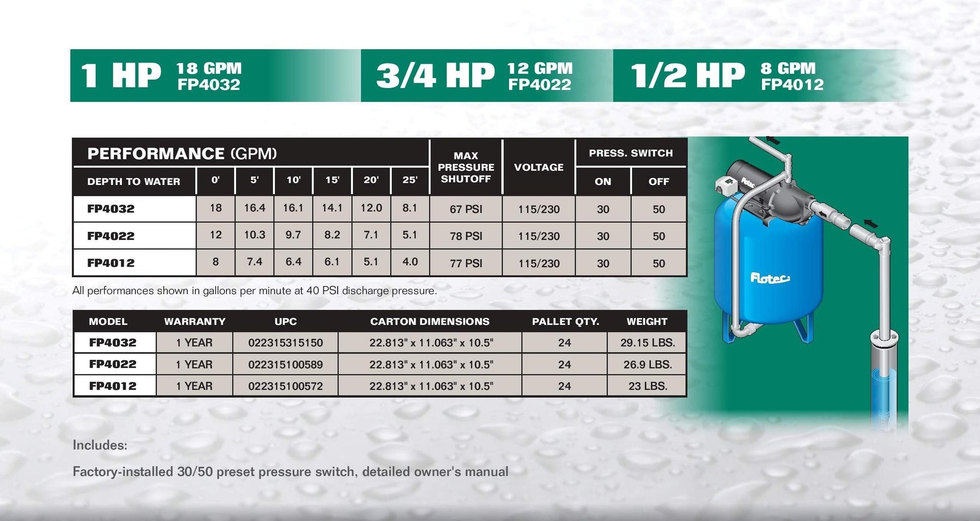 • Capacities up to 12 Gallons/Minute at 40 PSI (Average Household use 6-10 GPM) Fiberglass-Reinforced Thermoplastic Pump Housing for Highest Corrosion Resistance Pressure Switch Preset to 30-50 PSI Pressure Setting Ready to Install, Heavy-Duty 230 Volt Motor (See Manual for 115 Volt Conversion) Self-Priming after Pump Housing is Initially Filled (Check or Foot Valve Required) Serviceable Unit Superior Performance at 25' Depth to Water or Less TC2104 Pressure Gauge Recommended
