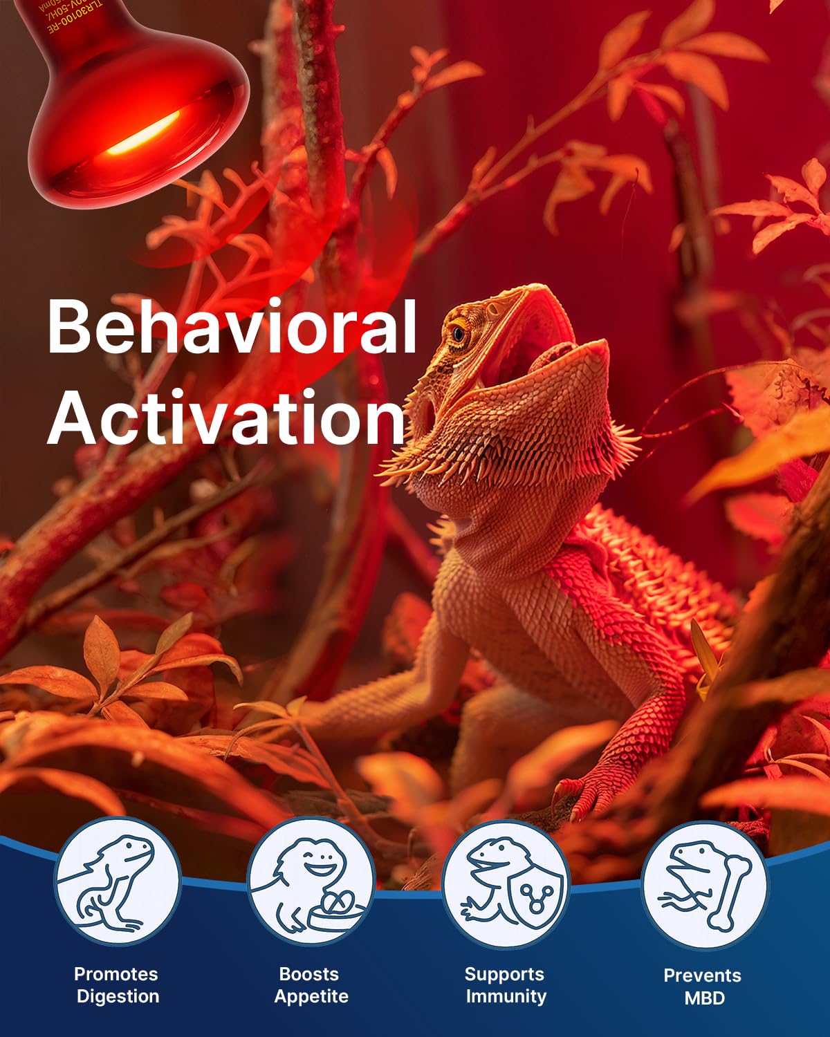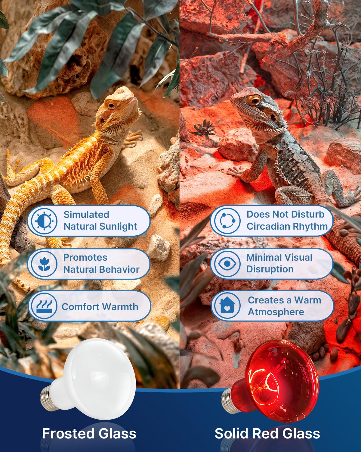 Infrared Basking Spot Lamp: The reptile heating bulb uses infrared light to increase the overall temperature of the terrarium, which helps promote the appetite, reproduction, and natural behavior of reptiles, effectively improving their immunity and healthy growth