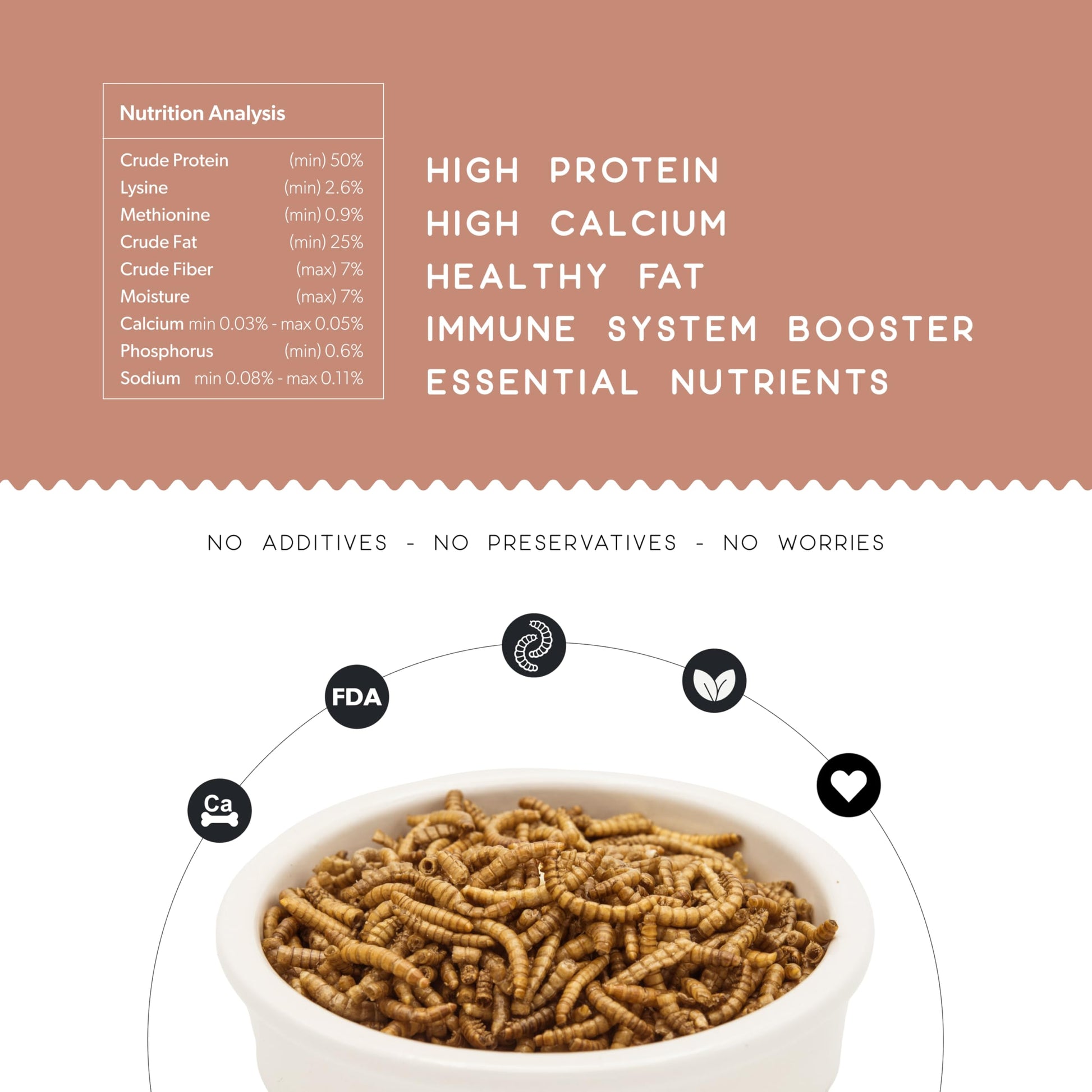 STURDY BOX WITH RESEALABLE BAG : Say goodbye to the struggle of live mealworms and the limitations of dried alternatives. Our sturdy box and resealable bag ensure convenient handling.
