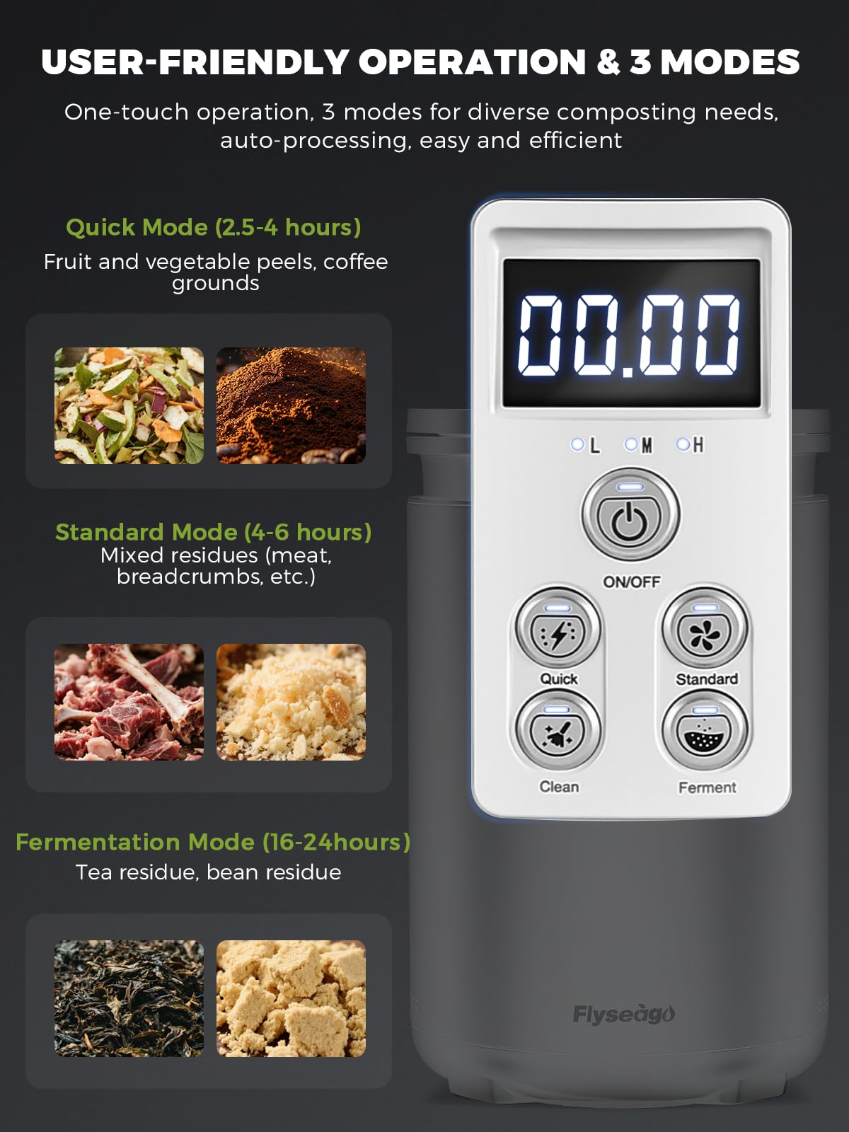 Powerful & Efficient Composting: Featuring a 700W high-power motor, this kitchen electric composter offers 3 modes—Quick (2.5-4 hours), Standard (4-6 hours), Fermentation (16-24 hours)—to reduce food waste volume by 90% in 3-6 hours through multi-stage grinding, high-temperature drying, and automatic cooling; its anti-tangle design effectively crushes bones, meat, vegetables, fruit, coffee grounds, bread crumbs, and more, transforming food waste and scraps into nutrient-rich natural fertilizer