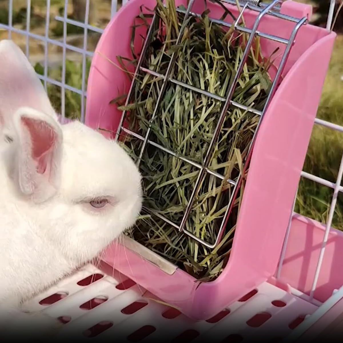 Humanized Design: The lip of the hay feeder is covered by stainless steel that can effectively prevents small animals from biting it. The garss rack has a spring mechanism that provides enough tension to fix the hay in the proper position and it is also removable that allow you to remove it for easy cleaning.