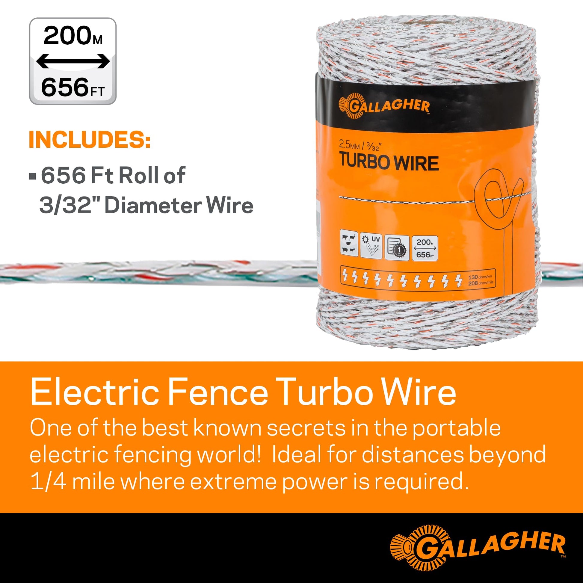 RELIABILITY YOU CAN TRUST: Gallagher's Turbo Wire has a long life and is ideal for use in windy conditions giving you peace of mind that your livestock and crops are safe. Each pack contains a 656 Foot Roll that can be reused again and again.
