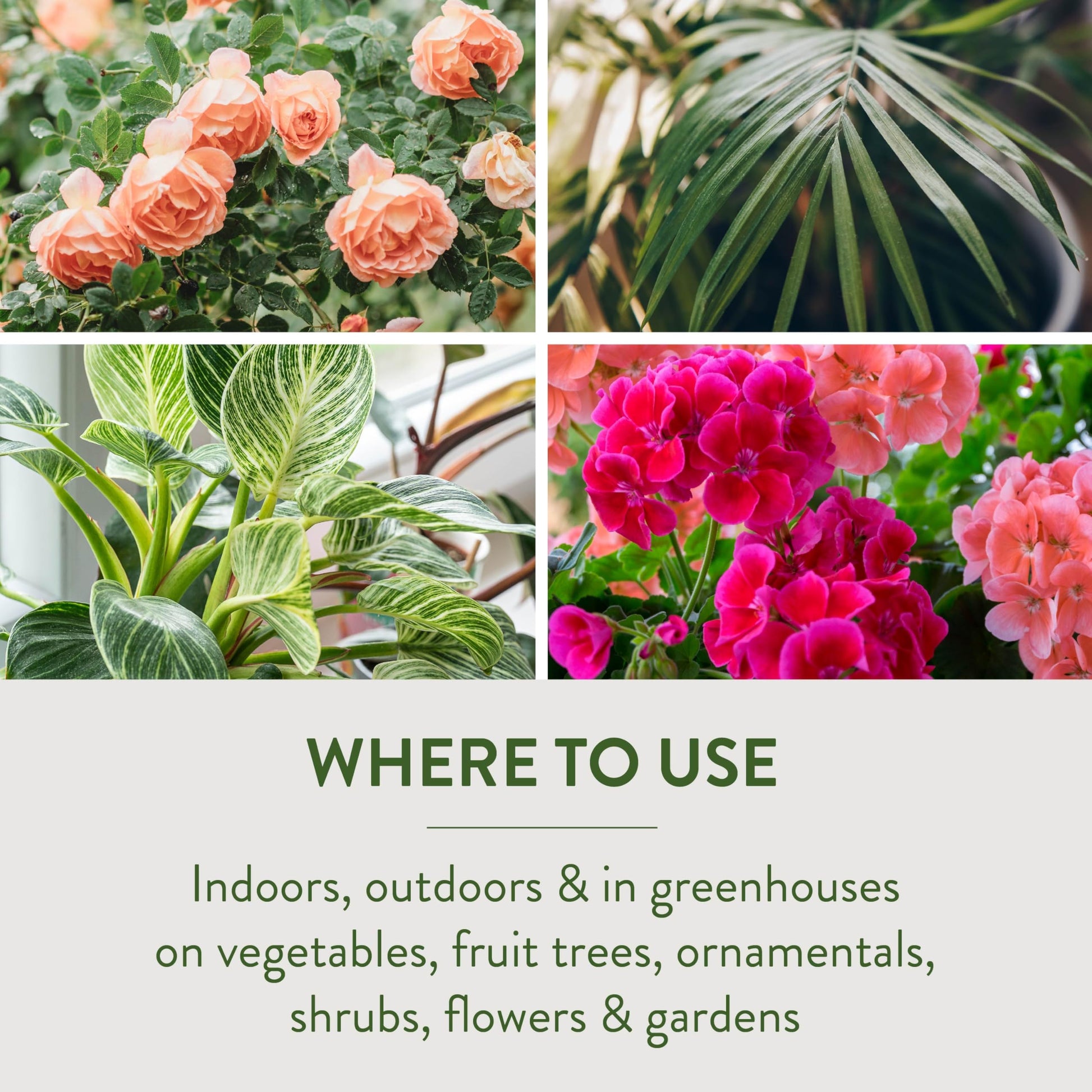 FOR ORGANIC GARDENING: This product can be used indoors, outdoors and in greenhouses on vegetables, fruit trees, ornamentals, shrubs, flowers and gardens
