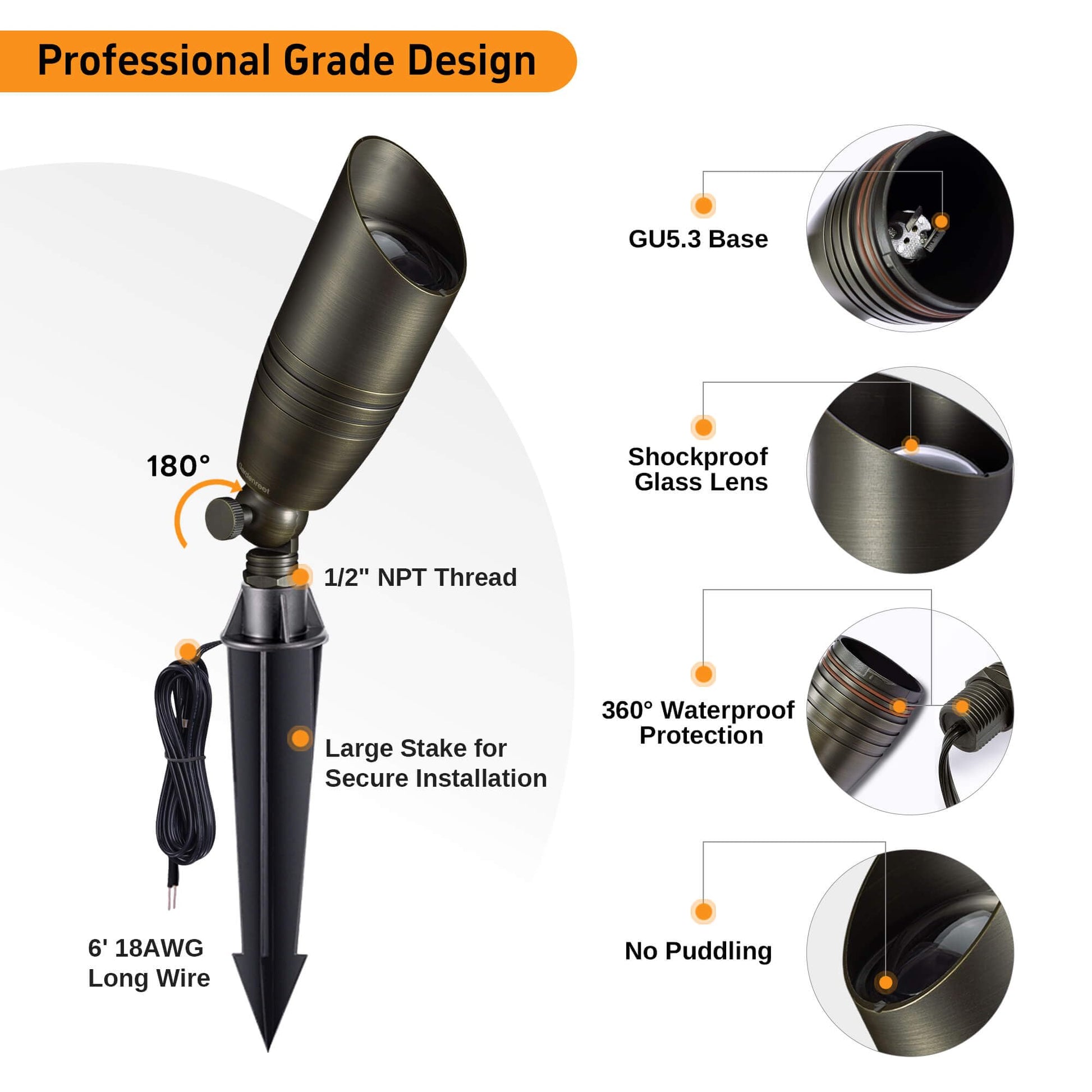 Gardenreet Die-Cast Brass Spot Light Outdoor - 12V LED Uplighting Waterproof, Low Voltage Landscape Lights Direct Wire, Bronze for Fence Fountain with Warm White MR16 Replaceable Bulbs (12 Pack)