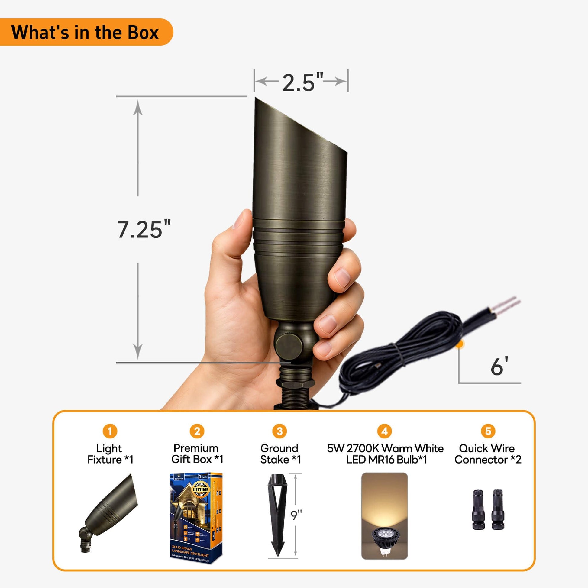 ๐๐ซ๐ข๐ ๐ก๐ญ: Outdoor spotlight with a 5 watt LED MR16 bulb (450lm). Lights up exterior trees, walls, flags, and fountains up to 10-12 ft. 180ยฐ adjustable while the ground stake stays in place