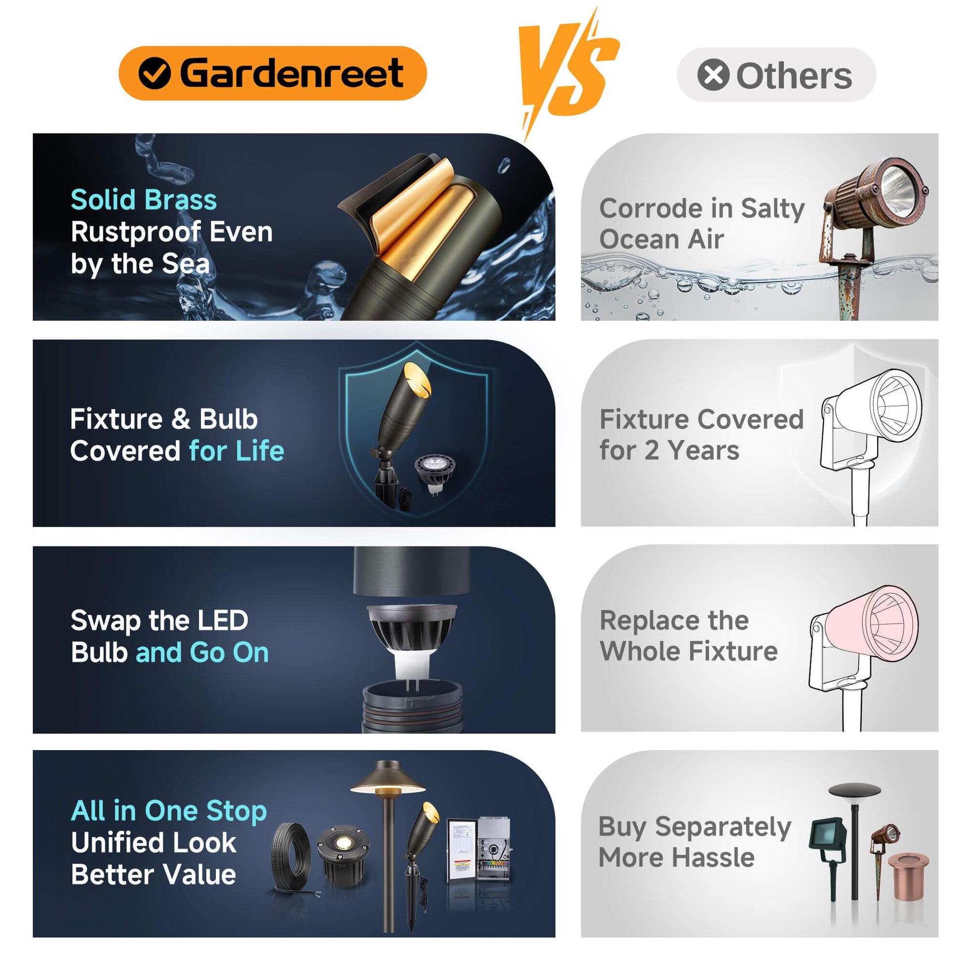๐๐๐๐ฏ๐ฒ-๐๐ฎ๐ญ๐ฒ ๐๐จ๐ฅ๐ข๐ ๐๐ซ๐๐ฌ๐ฌ: Gardenreet wired landscape lighting wonโt rustโeven in salty, humid air like CA or FL. Lasts over 10 times longer than aluminum. A top pick among outdoor dรฉcor influencers. Give your yard a designerโs touch. Fixture and bulb covered for life
