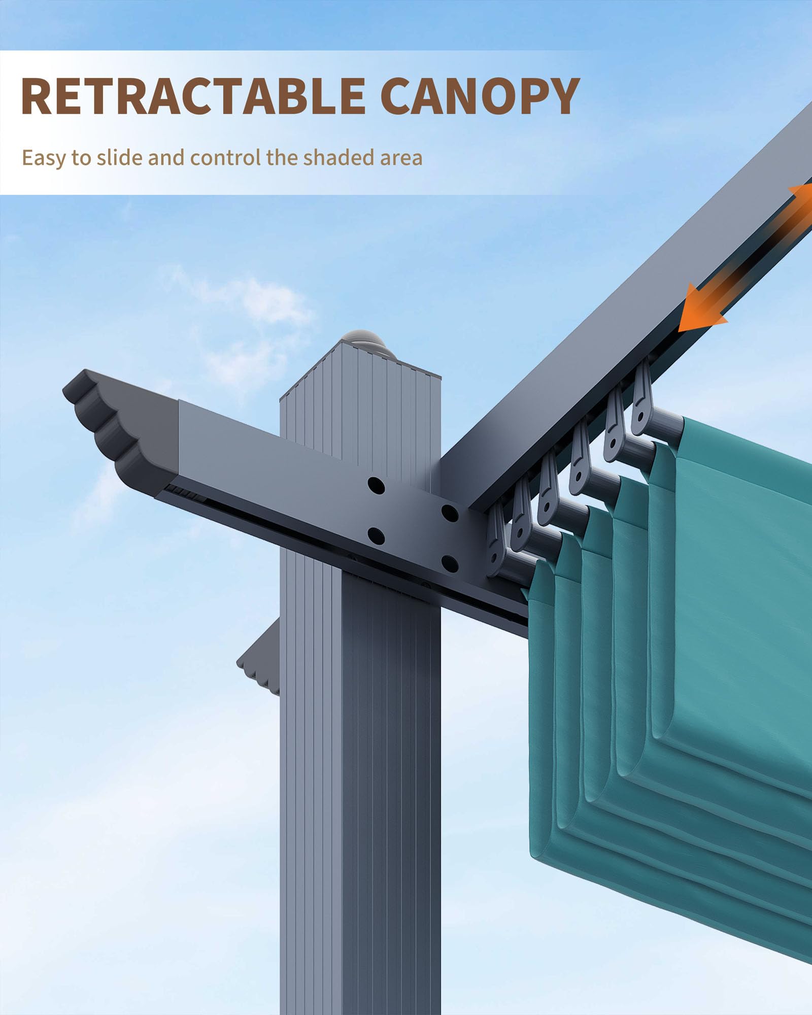 【UPF 50+ Sun Shade & Rain Protection】This patio pergola features a retractable polyester canopy (UPF 50+) to block 99% of harmful UV rays, plus fine side mesh screens that keep rainwater out while allowing airflow. Enjoy a cool, UV-resistant outdoor space for relaxing or entertaining