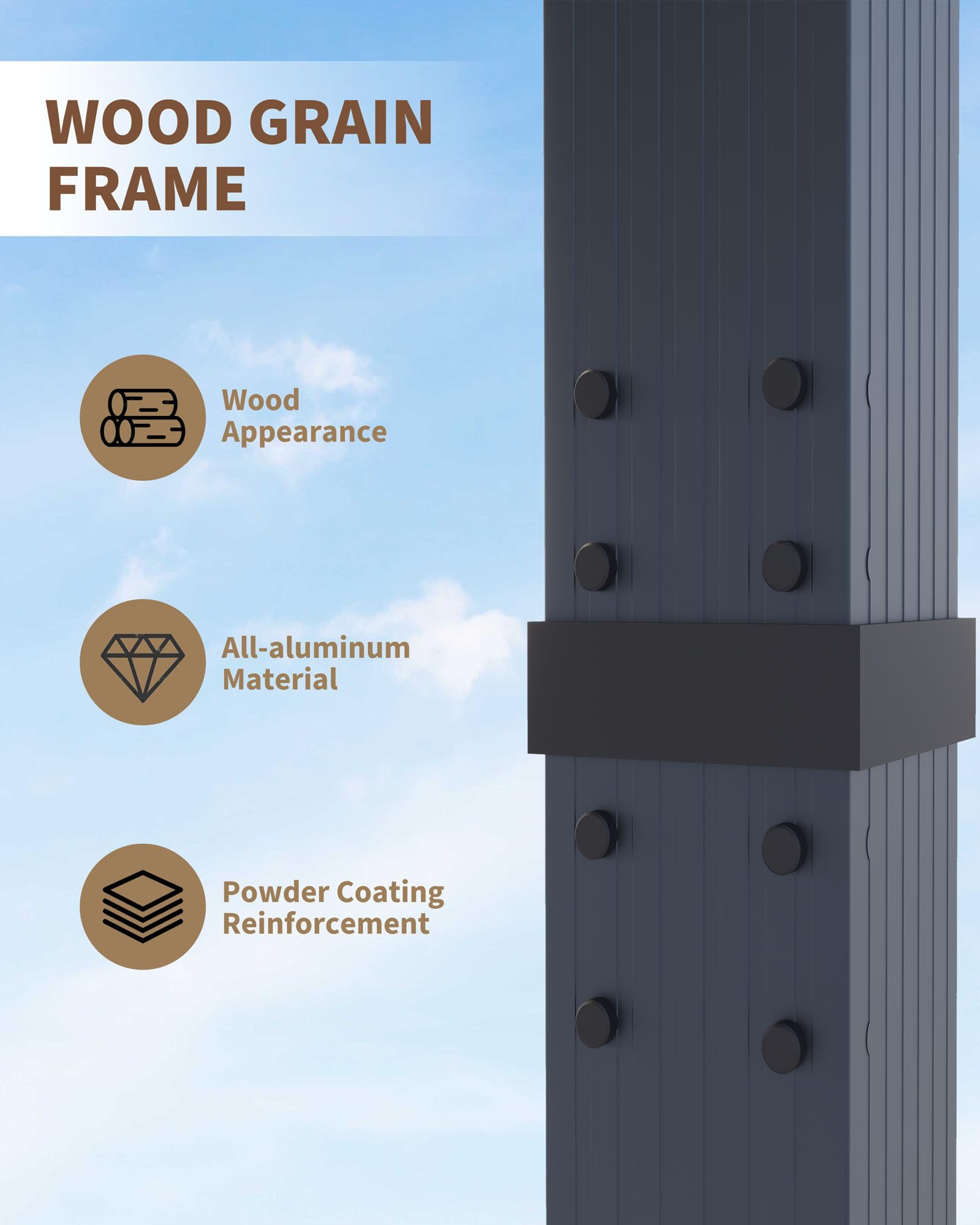 【Stable Construction】The outdoor pergola features a high-quality aluminum alloy frame with an exterior powder coating, providing excellent rust and corrosion resistant properties. This ensures the gazebo maintains structural integrity and aesthetics under various weather conditions