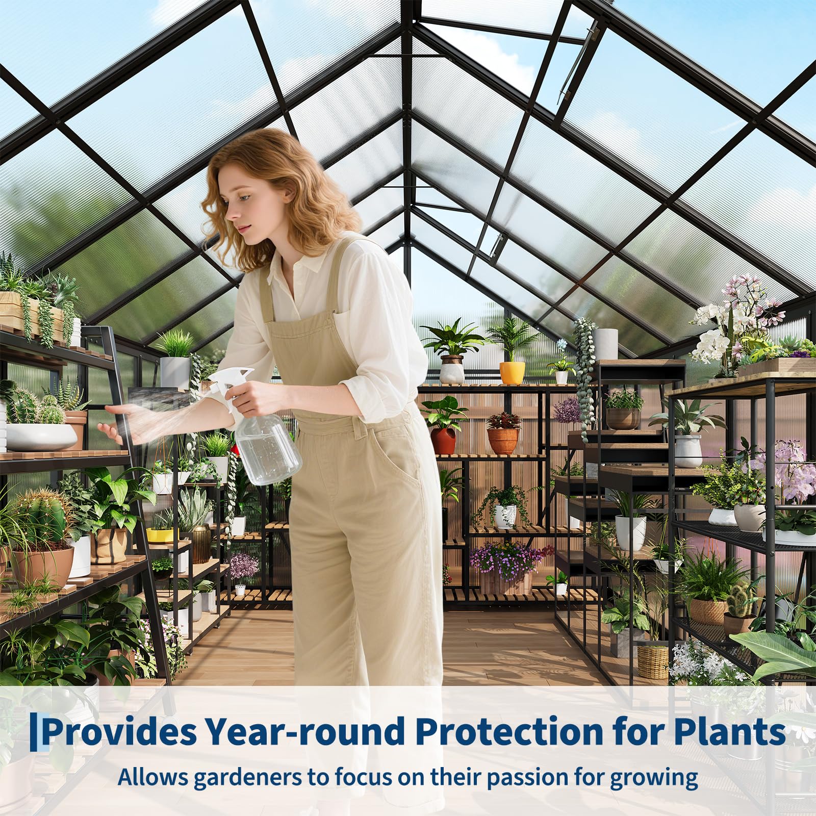【Effortless Setup】Transform your gardening space in no time. Our all-inclusive kit includes detailed instructions and every tool needed for straightforward assembly. With innovative slide-in polycarbonate panels, installation is 40% quicker and offers 35% stronger fastening compared to conventional systems—giving you a sturdy structure with minimal effort.
