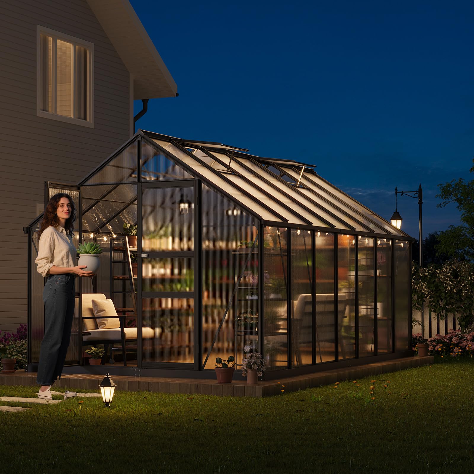 【All-Weather Resilience】Crafted to withstand the elements, our greenhouse pairs 720g/m² premium polycarbonate panels with a reinforced aluminum-steel frame. This rugged construction ensures unwavering stability during storms and high winds, creating a lasting sanctuary for your plants through every season.