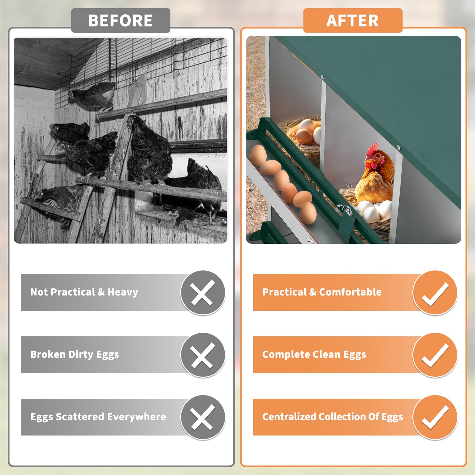 Unique Egg Collection Design: Chicken Nesting Boxes featuring a slight incline, the structure allows freshly laid eggs to roll safely into an accessible tray, eliminating the need to reach inside the nesting box. This ingenious feature keeps your precious eggs secure and easily collectible, making your daily farm chores more efficient.