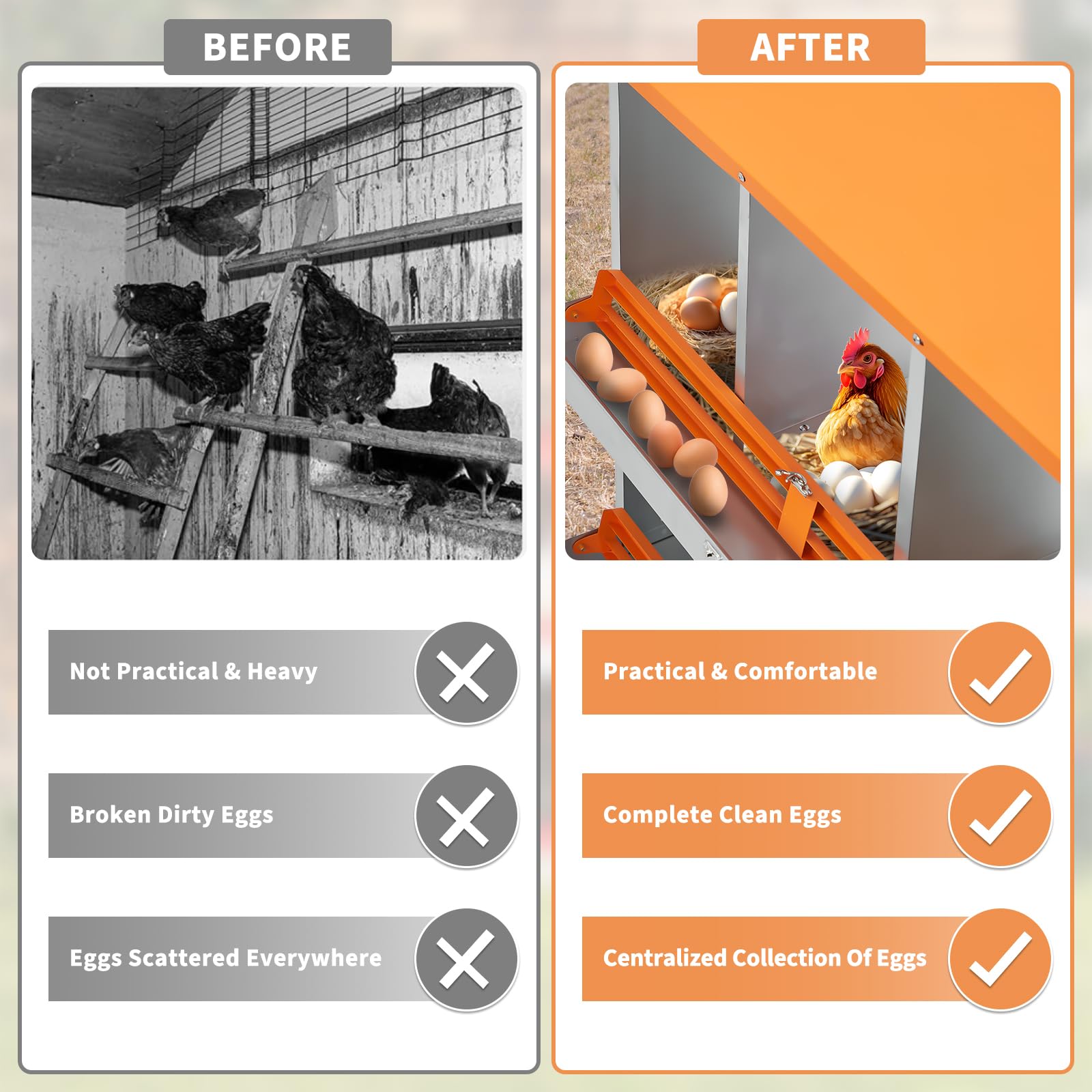 Unique Egg Collection Design: Chicken Nesting Boxes featuring a slight incline, the structure allows freshly laid eggs to roll safely into an accessible tray, eliminating the need to reach inside the nesting box. This ingenious feature keeps your precious eggs secure and easily collectible, making your daily farm chores more efficient.