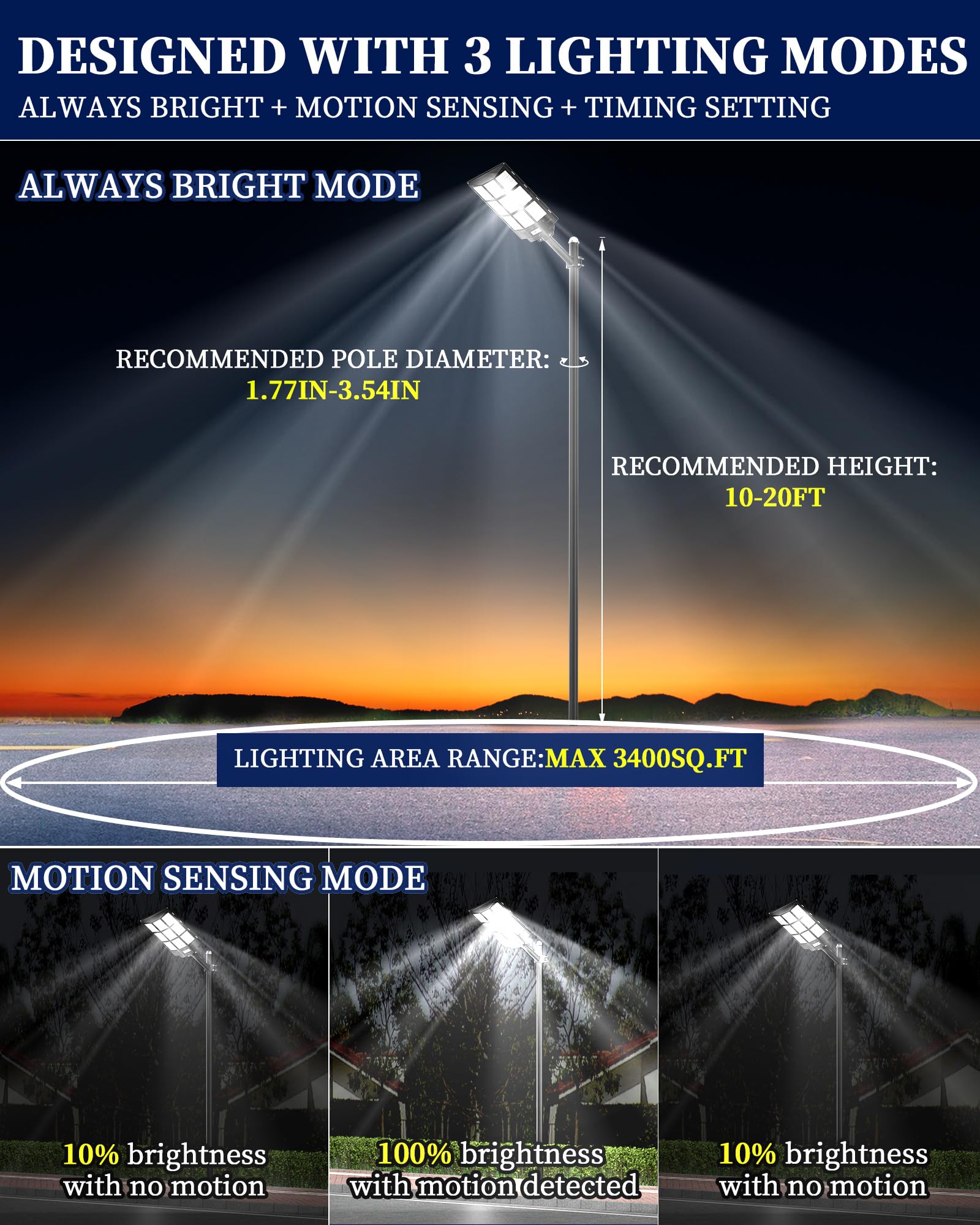 【 Wide Application & Easy Installation】The solar flood security light comes with a remote control and mounting accessories, which are convenient for long-distance use. Perfect for streets and parking lots, roads, basketball courts, Yards, garages, gardens, streets, patios and etc. With 3 lighting modes (always bright mode, motion sensing mode, timing setting mode 3H/5H/8H), 10%-100% brightness adjustable. Meet your lighting needs.