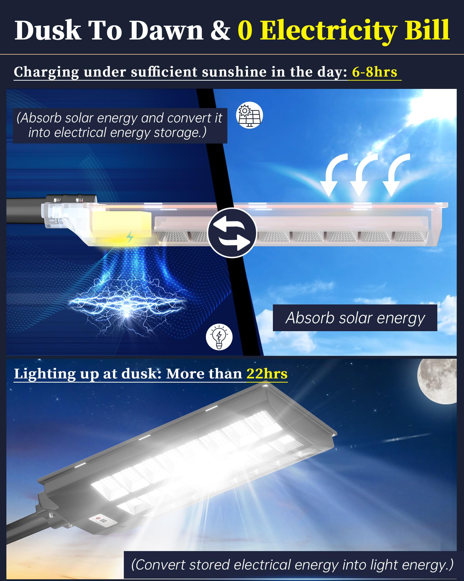 【No Electricity Bills】— Gefolly SL-8600W solar street light provides 6500K daylight white light, equipped with 192 super bright 5054 type LED beads and 33000mAh battery (lifespan up to 50,000 hours). Our super bright beads are 20 times brighter than ordinary beads. IP67 waterproof rating enables it to work properly even in bad weather all year round. Solar powered, no electricity bills, automatically turns on at dusk and turns off during the day.