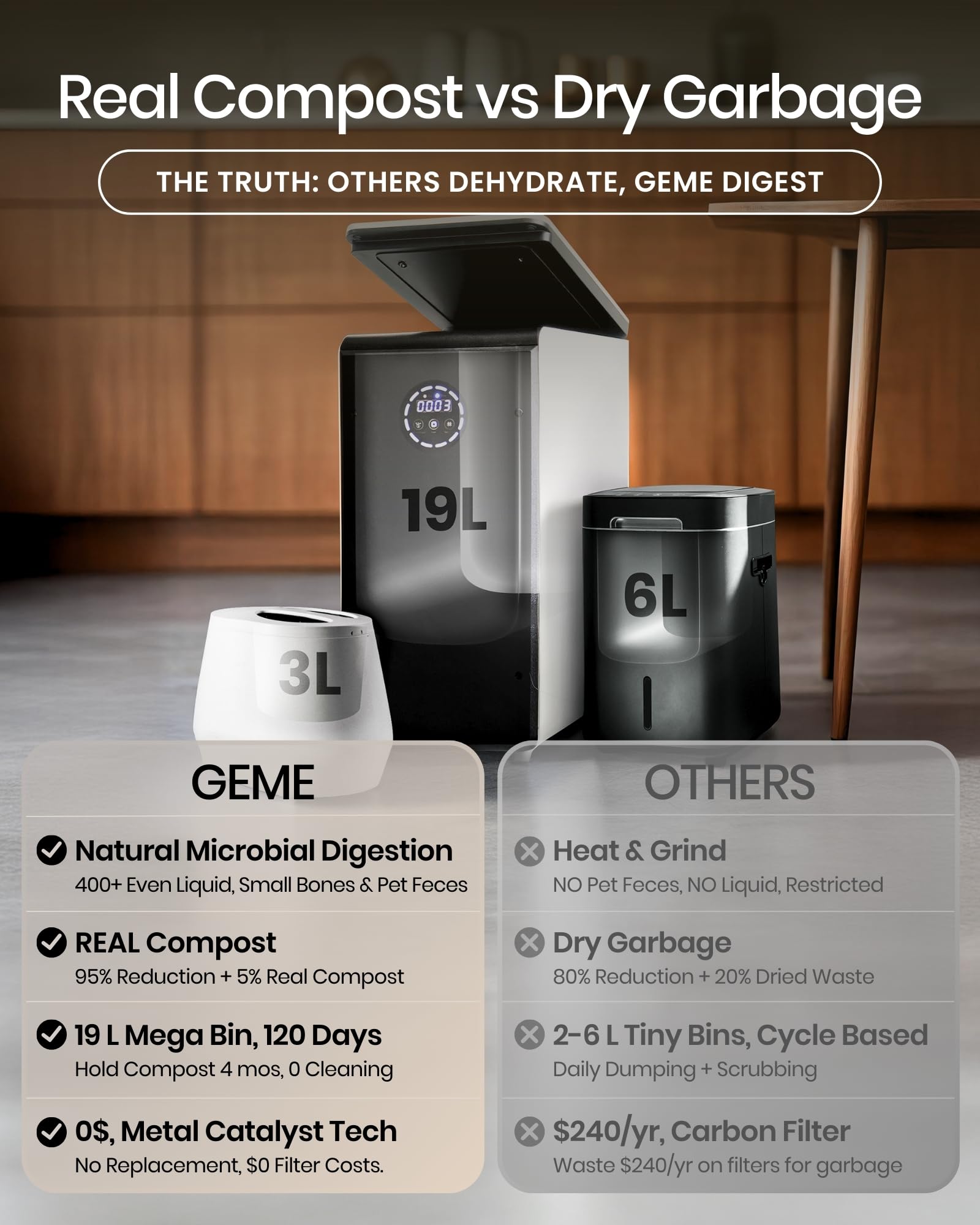 Electric Composter, Real Composting: World's First Bio Compost Machine for Kitchen. Instead of dehydrated waste, GEME Electric Composter is designed to break down your food waste with microbial degradation technology in just 6-8 hours and eventually turn it into rich, organic compost