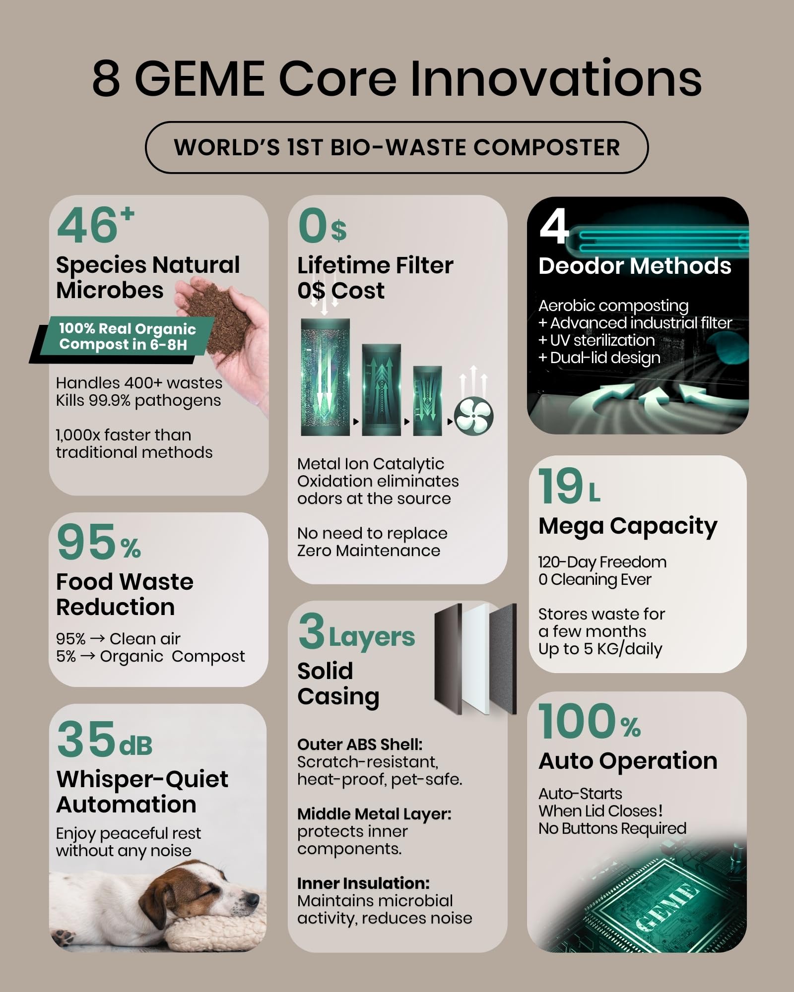 Silent Odorless Compost Machine: Built-in industrial grade deodorization system, without grinding process or high-temperature dehydration, GEME Composter indoor Electric is Odorless, Silent and Safe