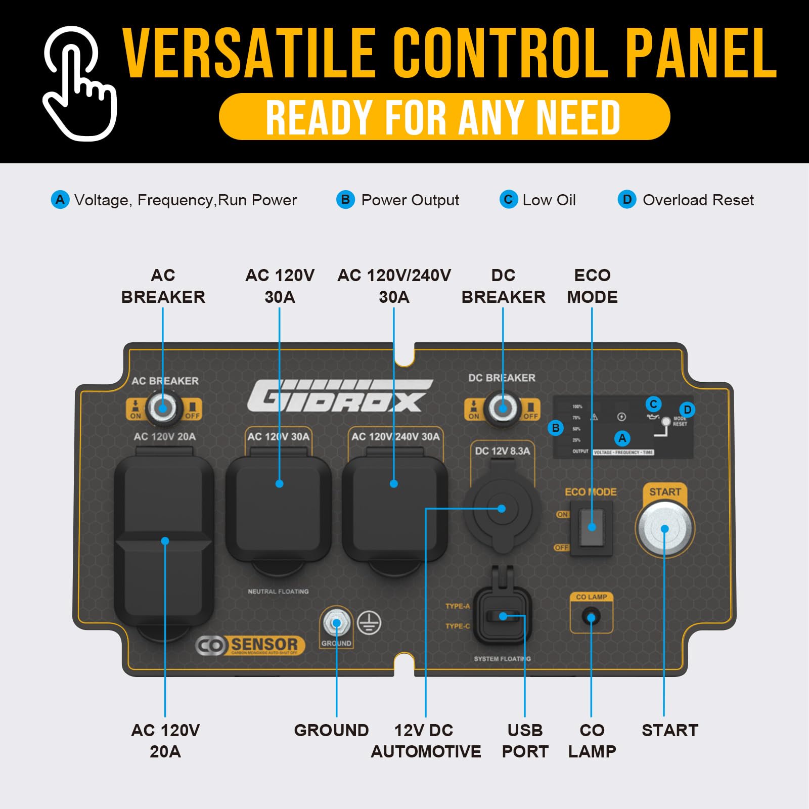 Inverter Tech with Powerful Engine – The GIDROX 6000D delivers clean pure power with less than 3% THD — safe for laptops, medical devices, phones, and other sensitive electronics.Its powerful 322cc 4-stroke OHV engine ensures consistent performance, improved fuel efficiency, and reduced emissions for both home and commercial use.