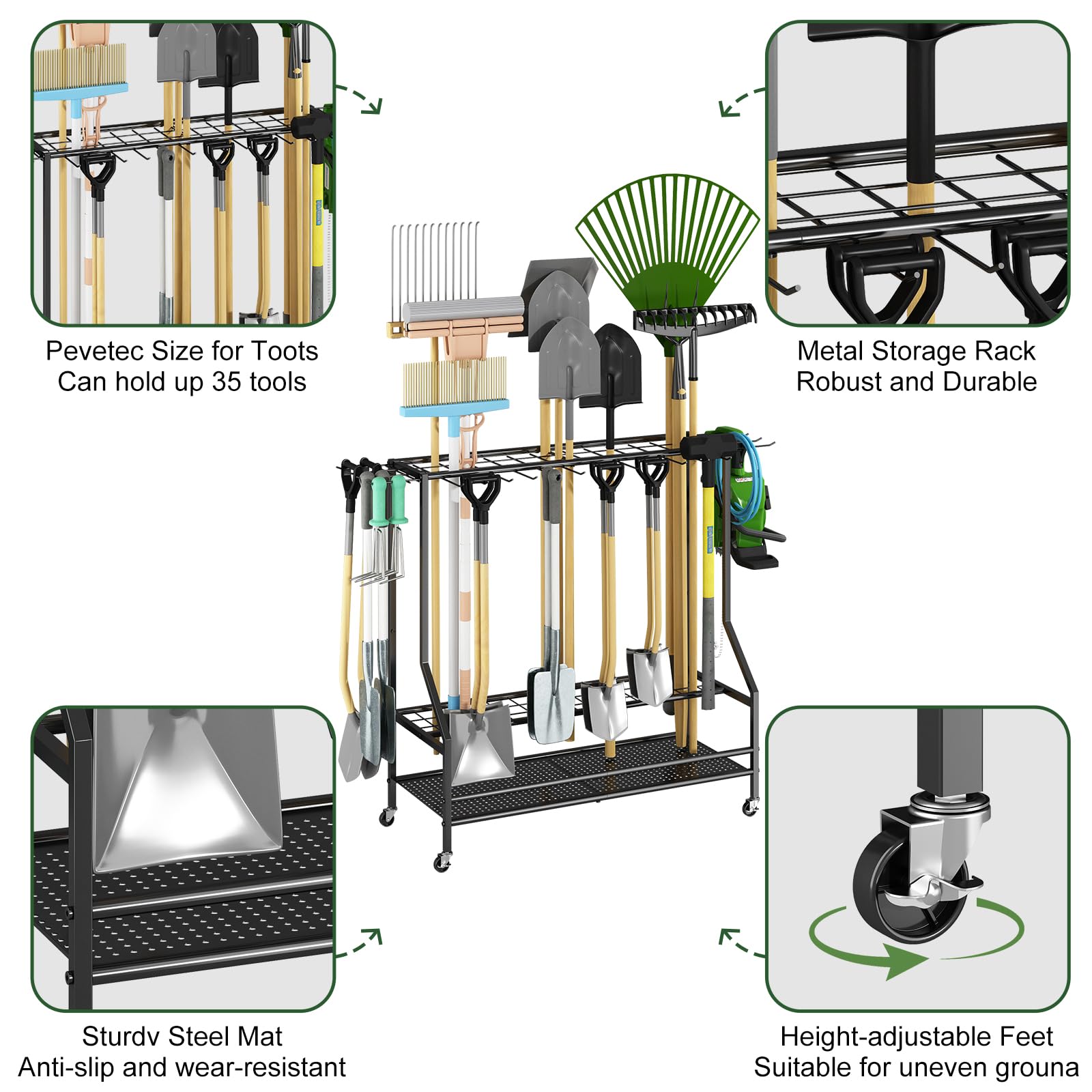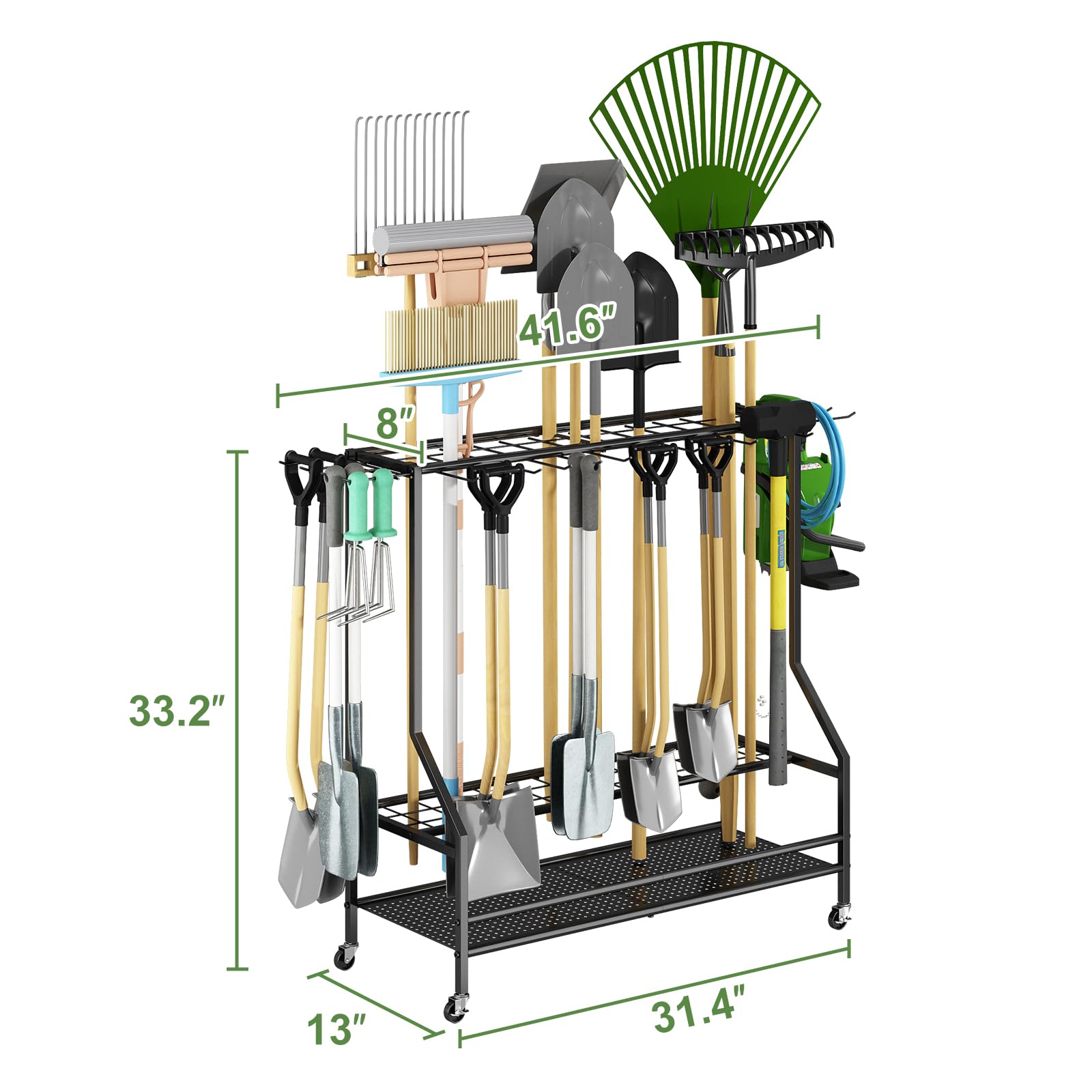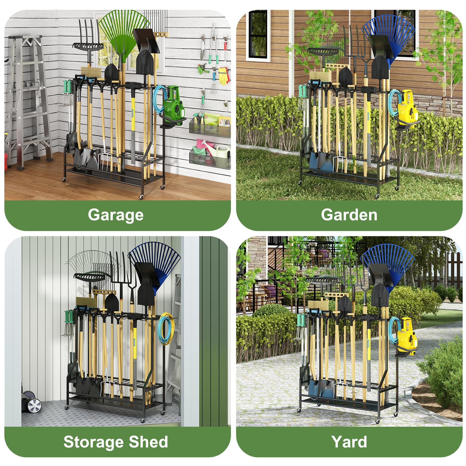 GILLAS Garden Tool Organizer for Garage, Utility Storage Racks with Hooks, Metal Yard Tool Stand Holder Organizer for Long-Handled, Broom, Shovel, Rake, Sturdy Heavy Rack for Outdoor, Yard, Black