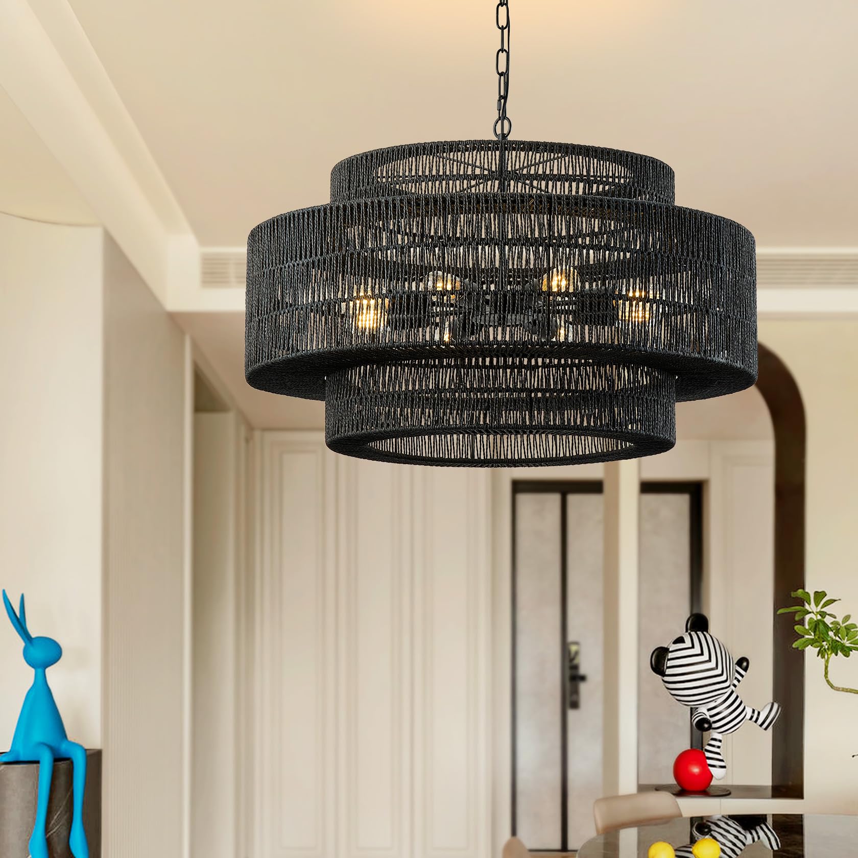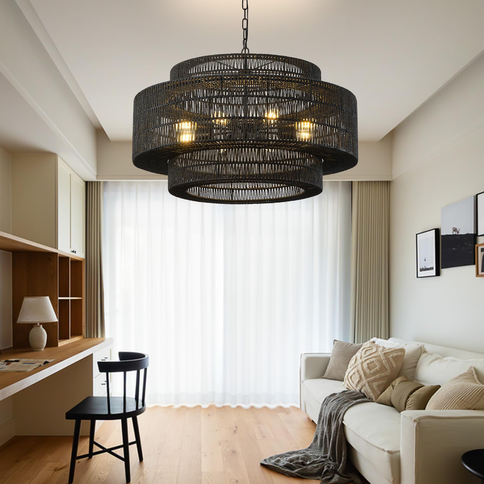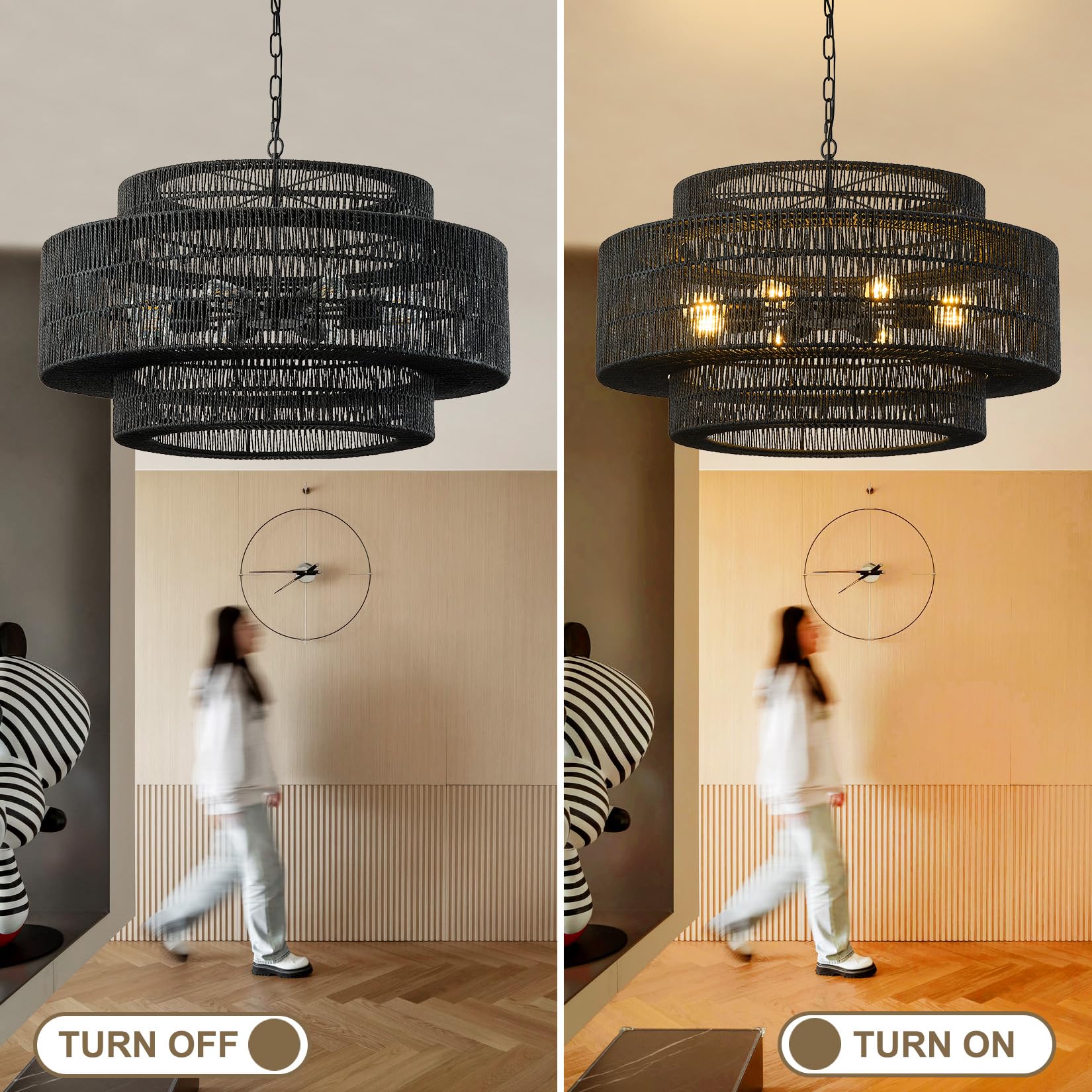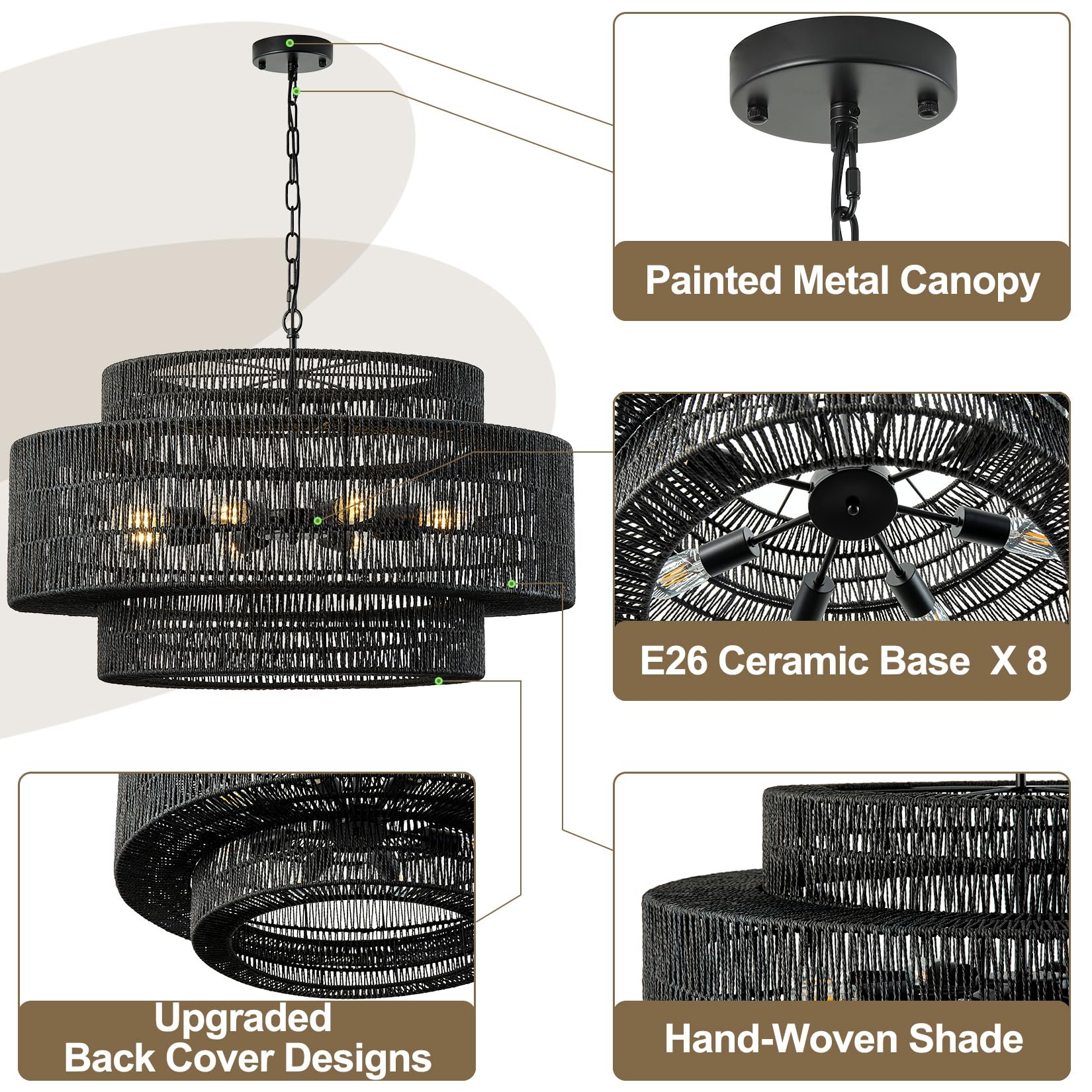 Giutna 31.5"Large Boho Rattan Farmhouse Chandeliers for Dining Room,8-Light Rattan Hand-Woven Rustic Drum Chandelier Pendant Light Fixture for Kitchen Island Bedroom Living Room Entryway Foyer(Black)