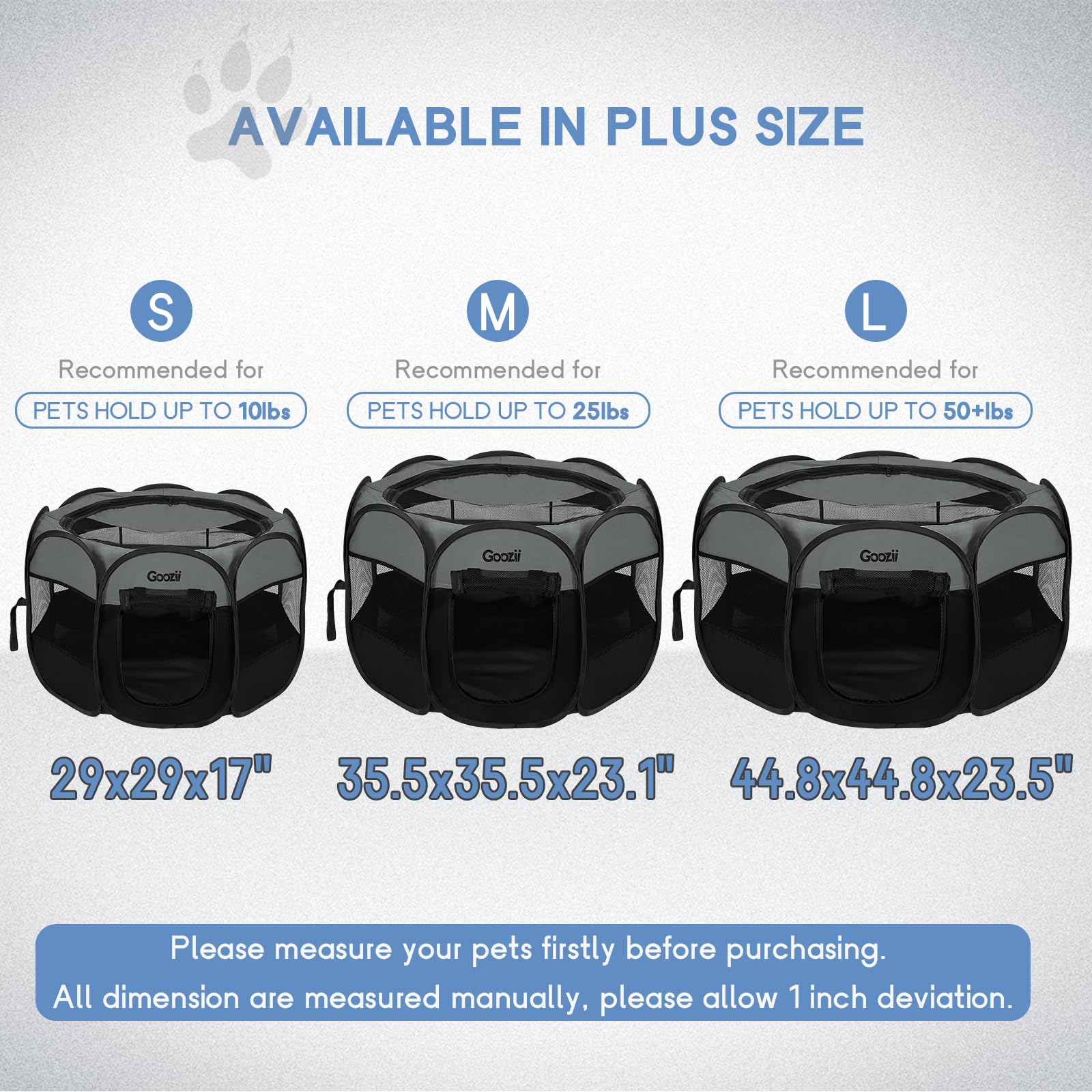 【Spacious & Comfort】: This dog playpen keeps your pet stay in this pet pen secure, spacious interior give more fun for your pet. Size is 35.5*35.5*23.1 inches, great for small animals up to 25 LB. There are 1 inch error range because of technical issue.