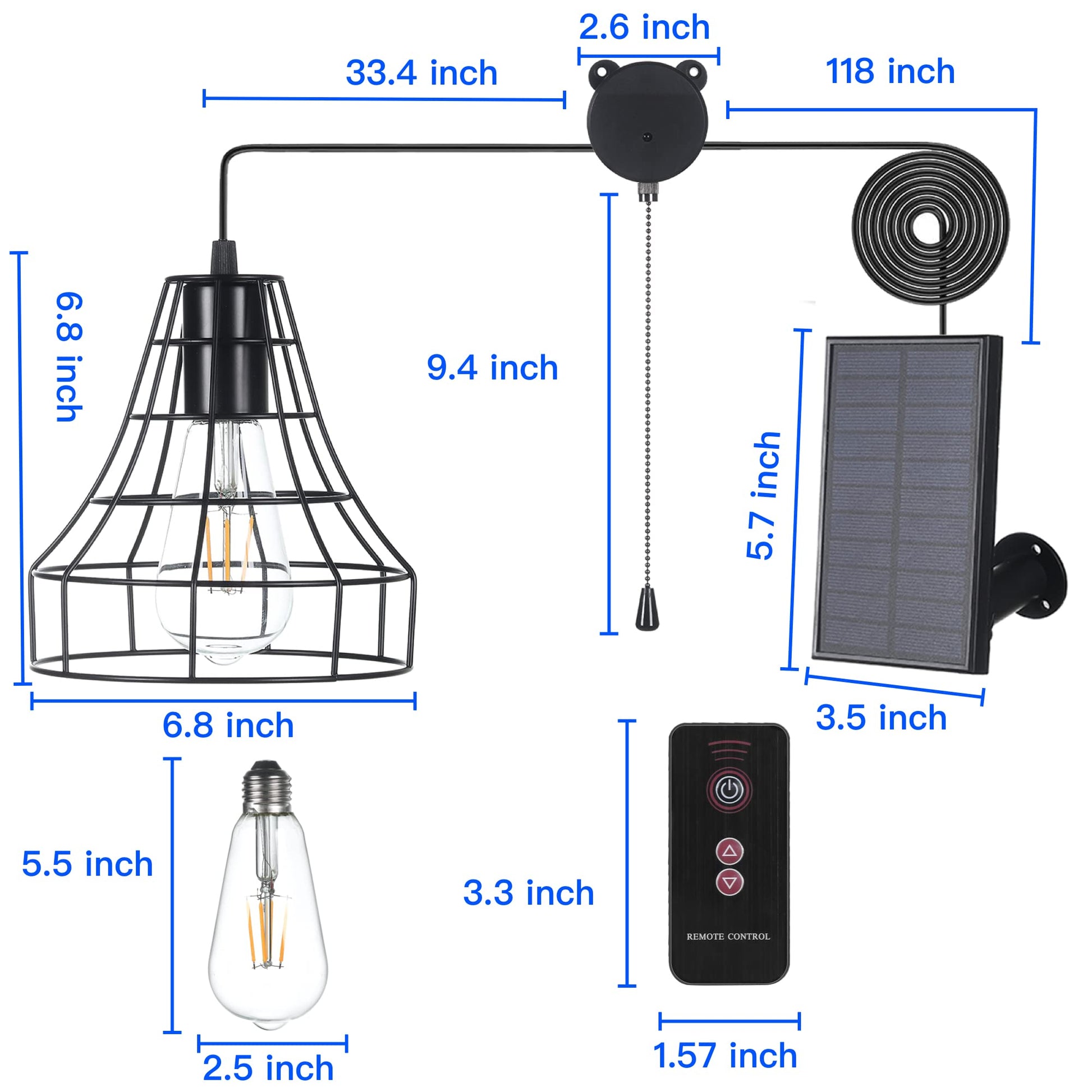 💡【Widely Used】Pull cord solar indoor light with remote control made by high-quality metal with an anti-rust effect, and a classic modern design.With great heat dissipation, suitable for porch, yard, garage, balcony, chicken coop, home, workshop, green house working, stair, barn, storage shed, etc...☼☼NOTE:When using for the first time, please put this lamp under the sunshine to charge 4 hours.