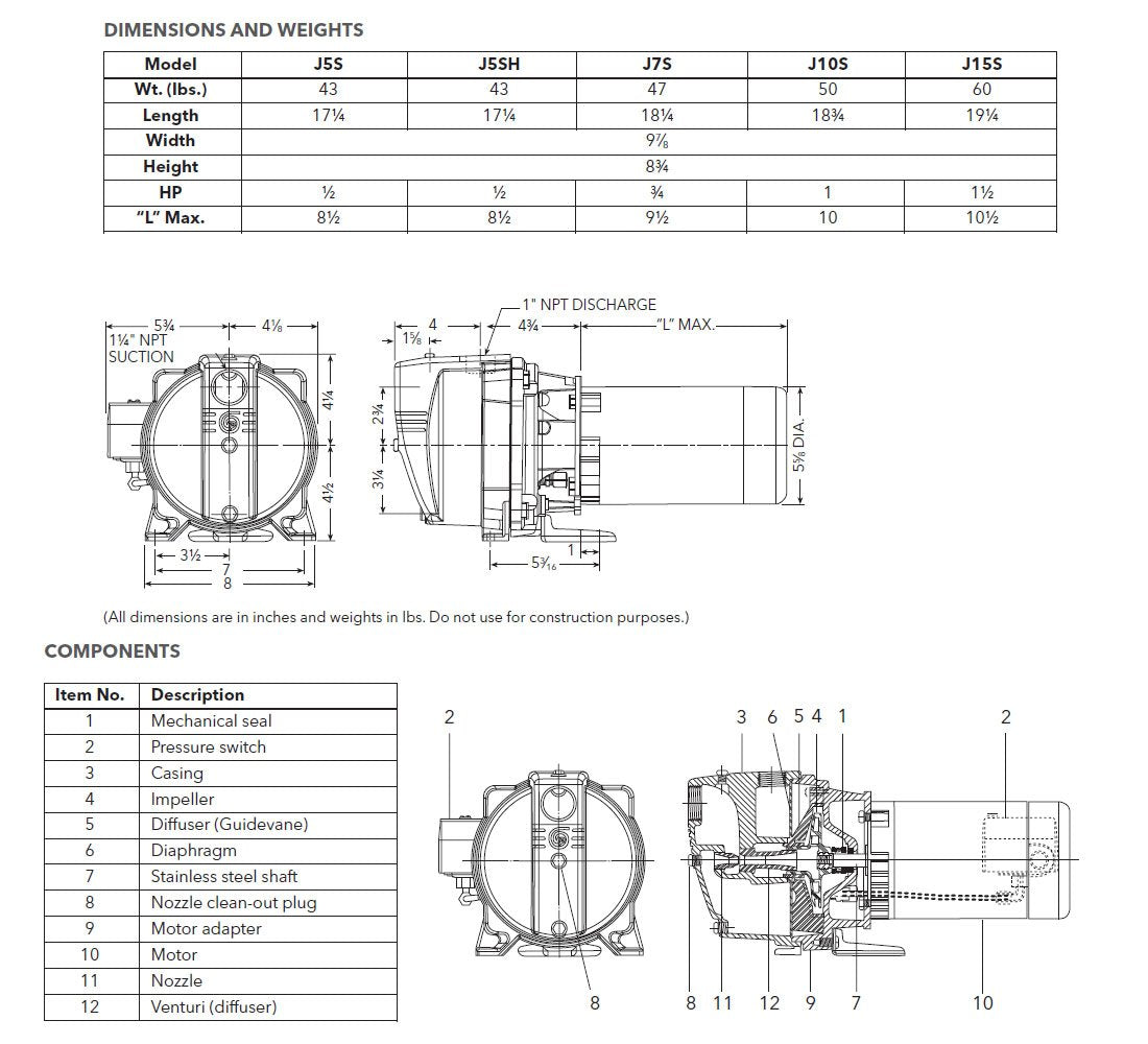 • Pipe connections: 1. 25" Npt suction and 1" Npt discharge, pressure switch: as4 preset (30-50 PSI).